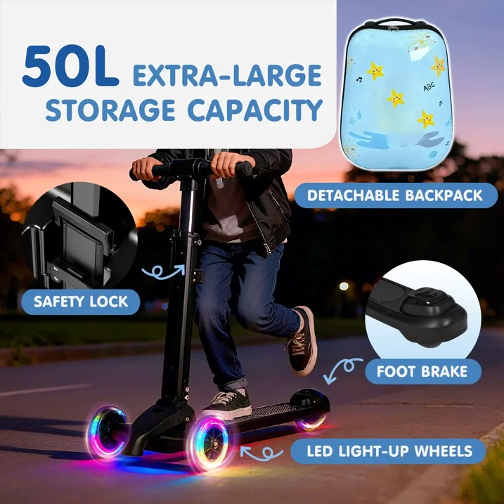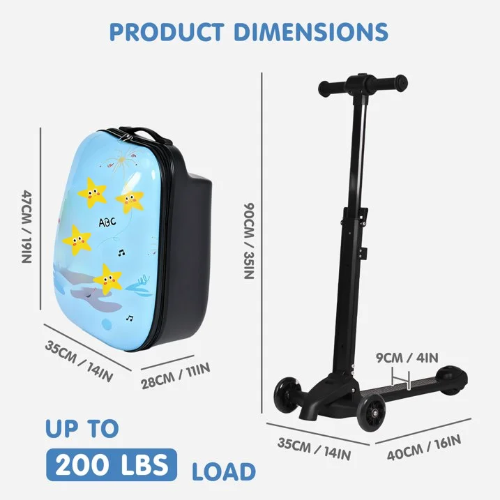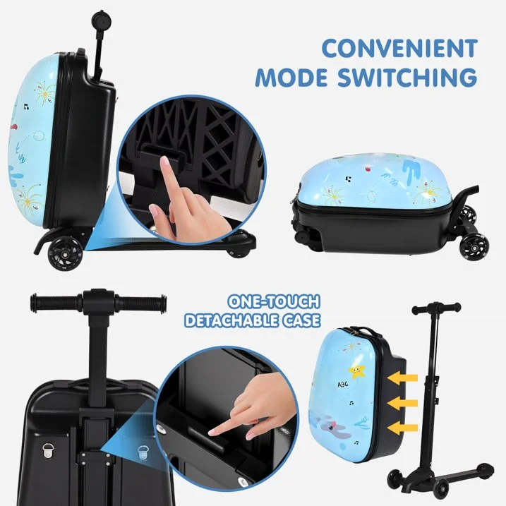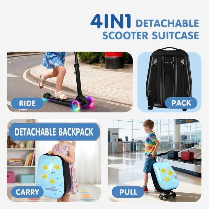 Light Blue 4-in-1 Detachable Foldable Hardside Suitcase with LED Wheels Convertible Scooter Backpack Luggage for Kids & Adults