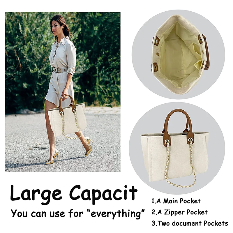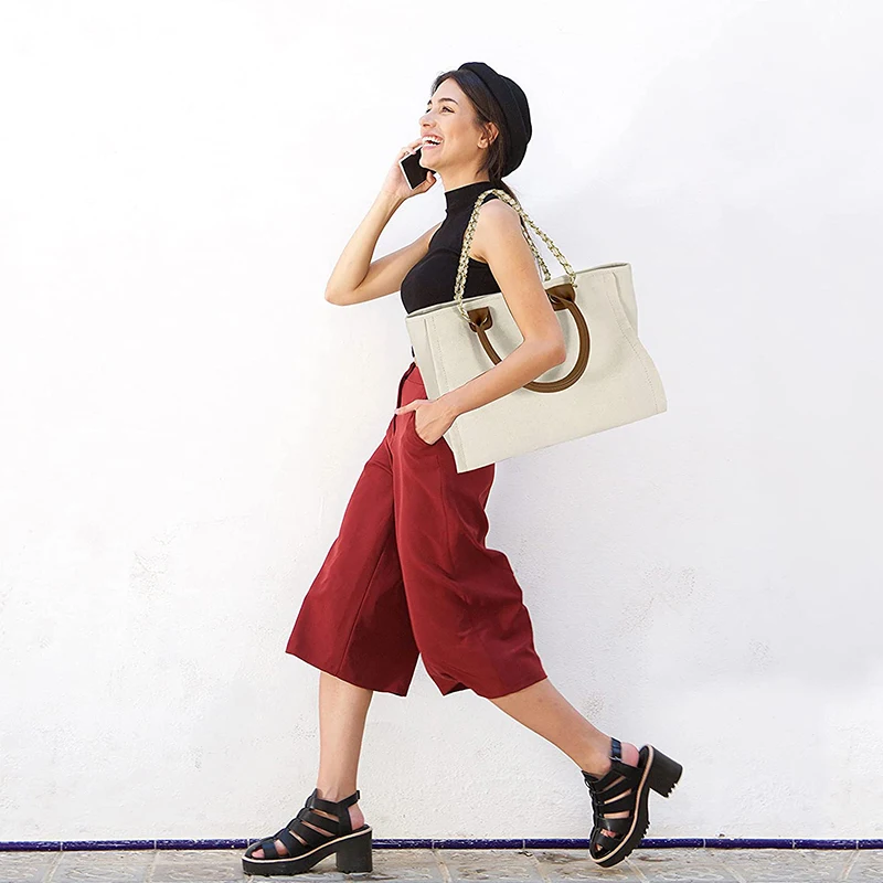Fashion Women Custom Logo Leather Handle Plain Tote Satchel Canvas Shoulder Bag With Chain