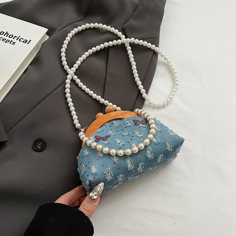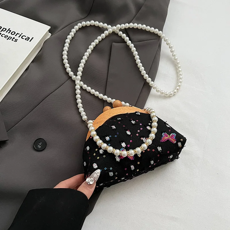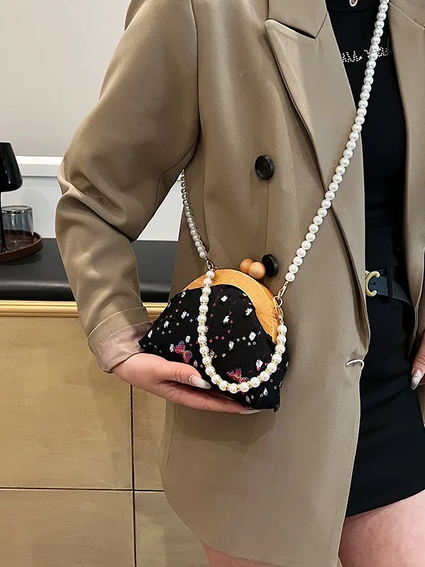 Colorful Canvas Small Shell Shoulder Bags Wooden Hasp Pearl Beading Compact Crossbody Bags for Women 2026 Casual Cute