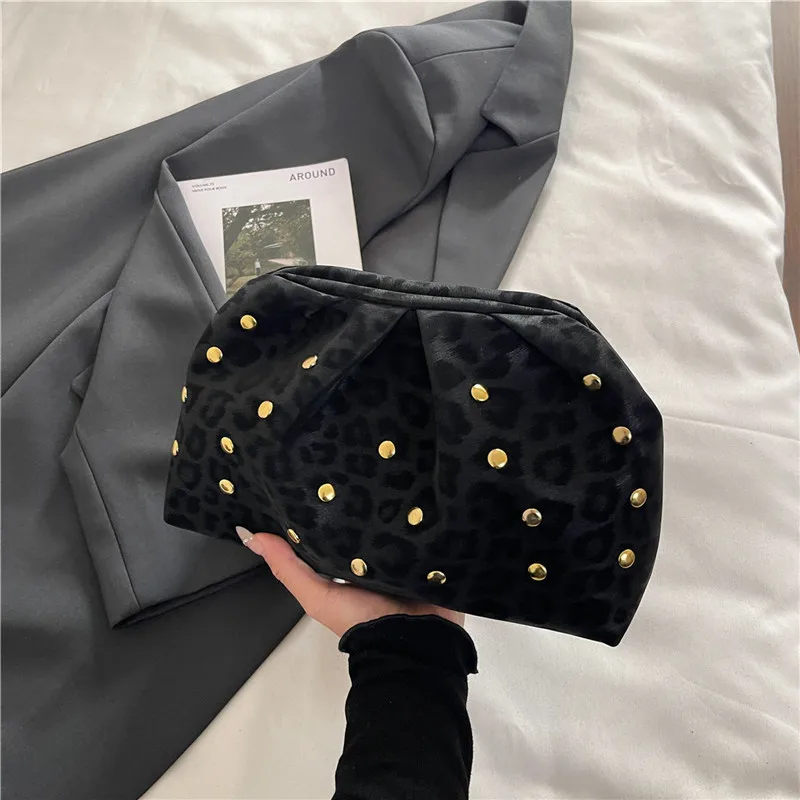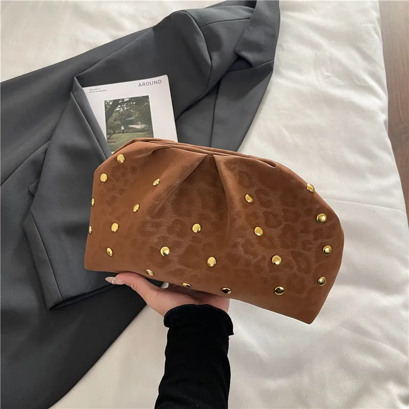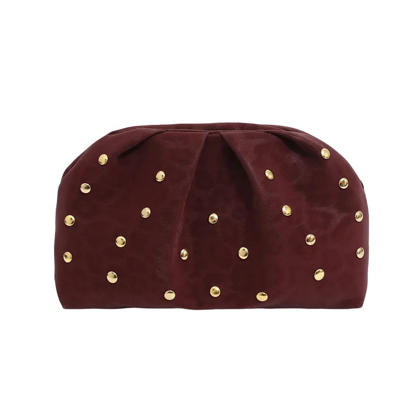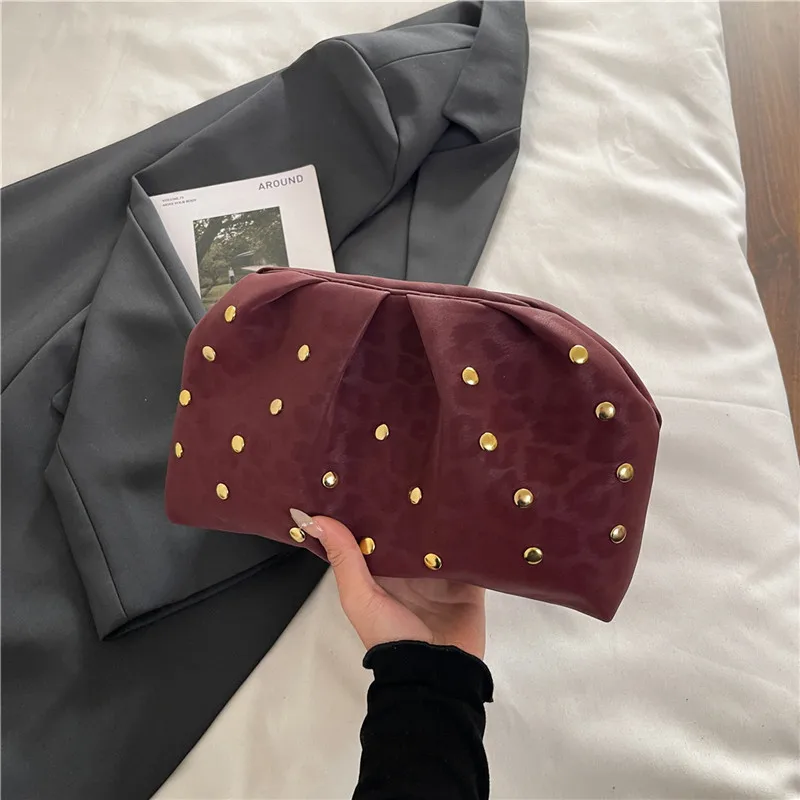 Simple Versatile Clip Evening Handbags for Women Solid Color Rivet Pleated Design Ladies Clutch Female Soft Purse