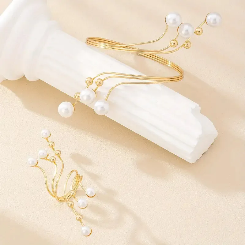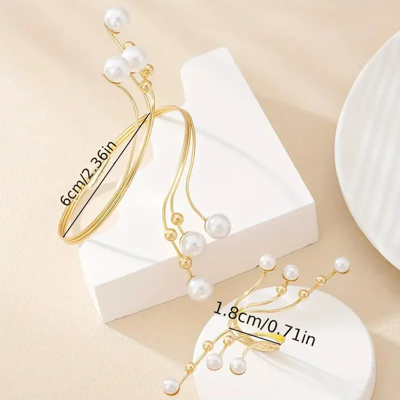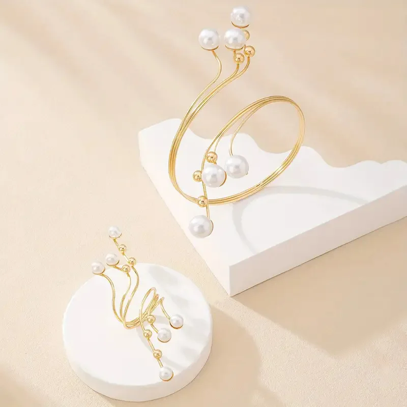 New Elegant Exaggeration Double Layer Large Pearl Bangles for Women Fashion Geometric Irregular Ring Accessories Jewelry Set