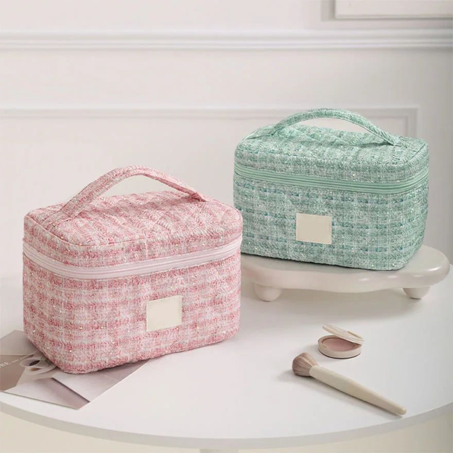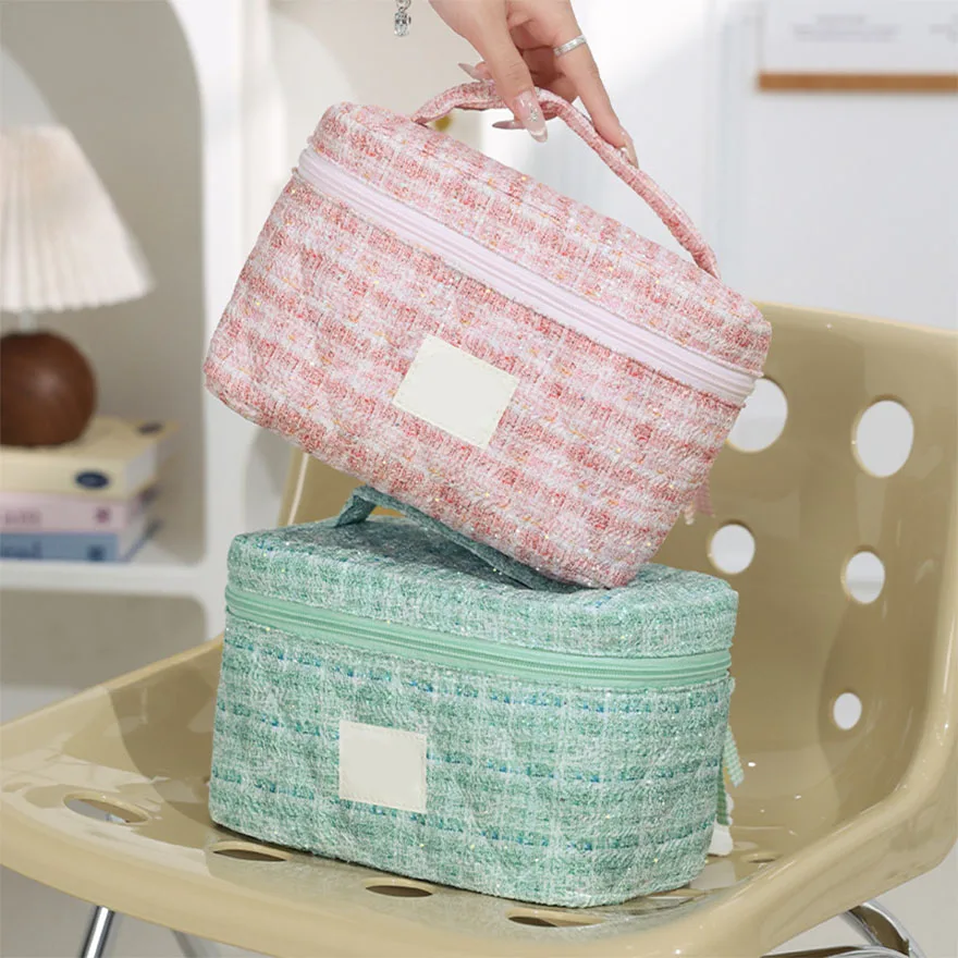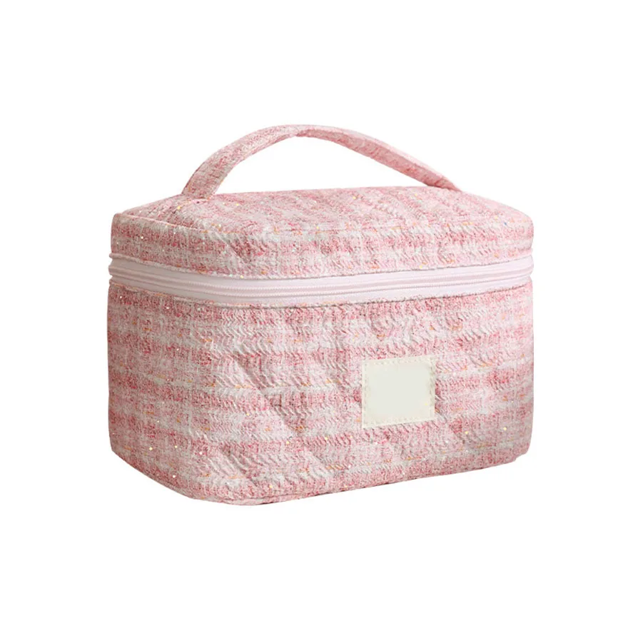 Quilted Cosmetic Bag Large Capacity Travel Organizer with Zipper Closure Letter Pattern Portable Makeup Storage Case for Women