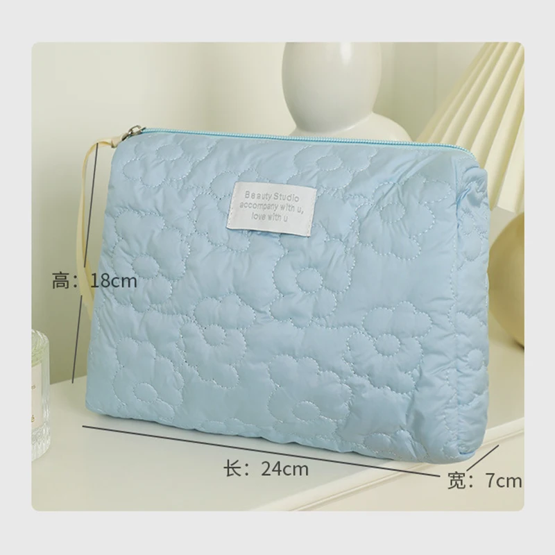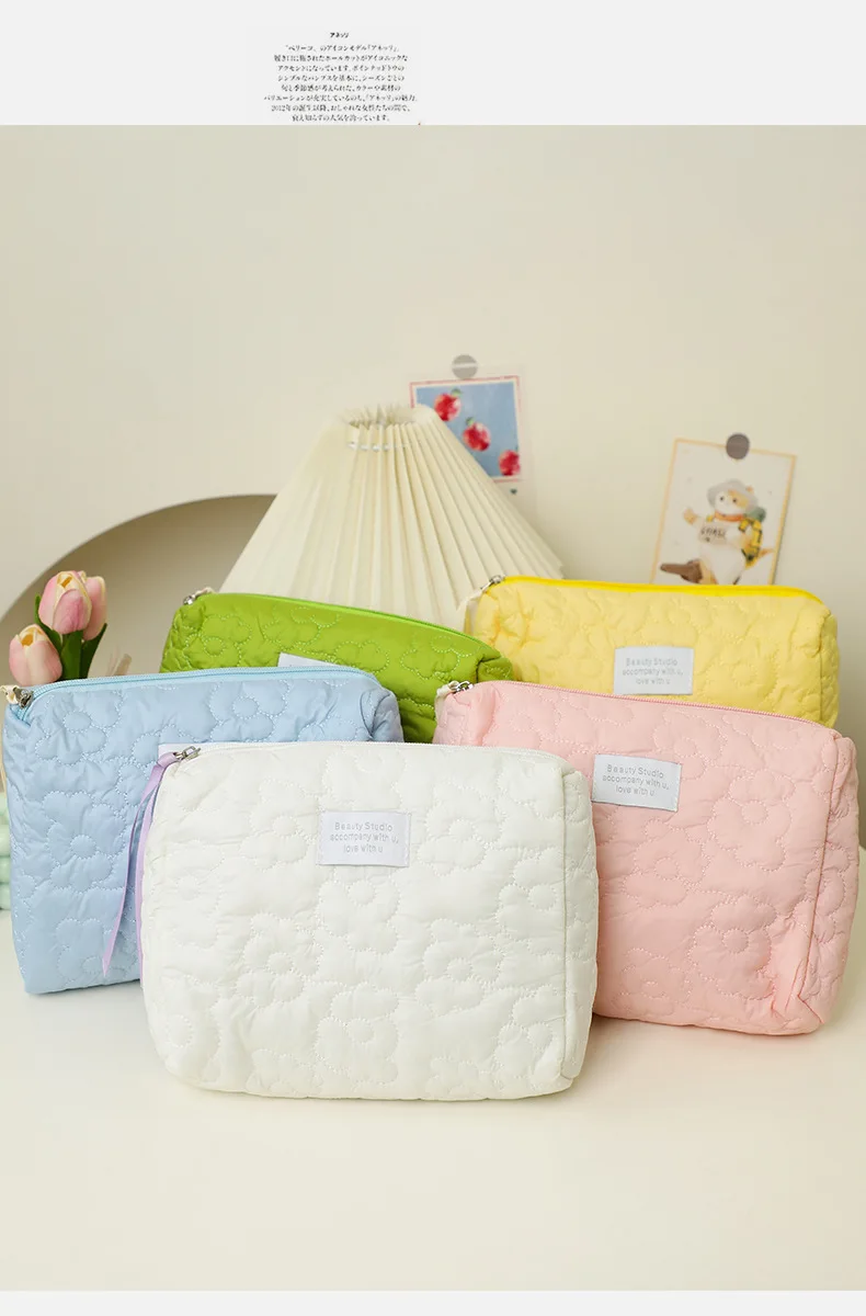 New Puffer Cosmetic Pouch Women Hand Bag Lightweight Makeup Pouch Cloud Bag Cute Flower Handbag Candy Color Pleated Clutch Bag