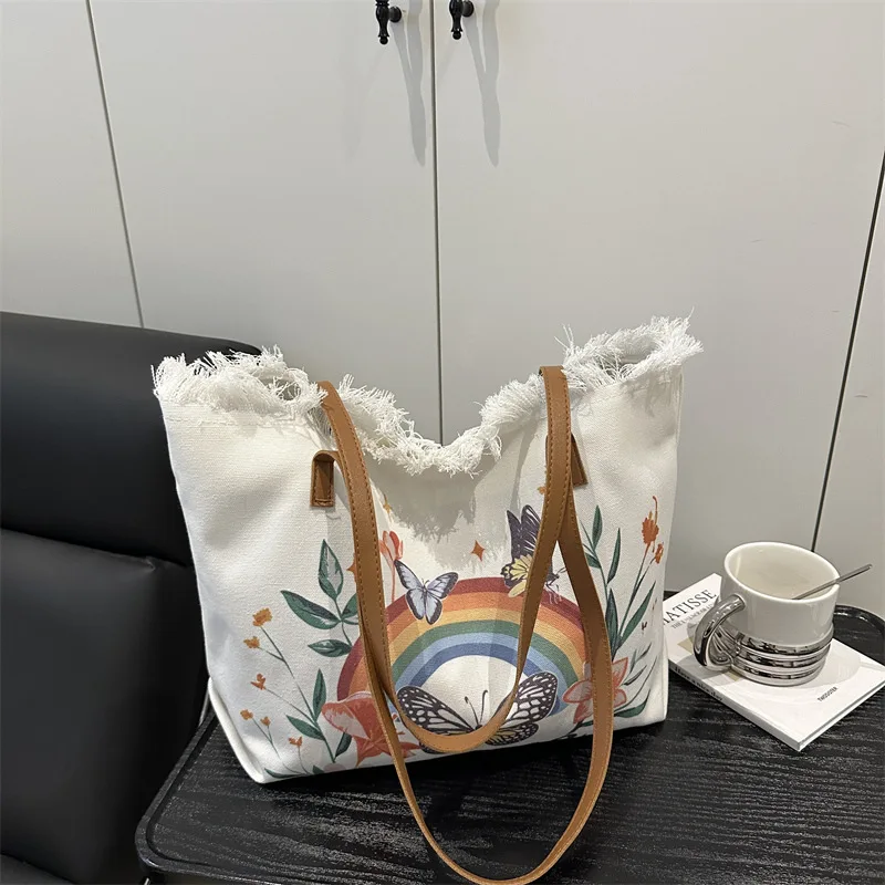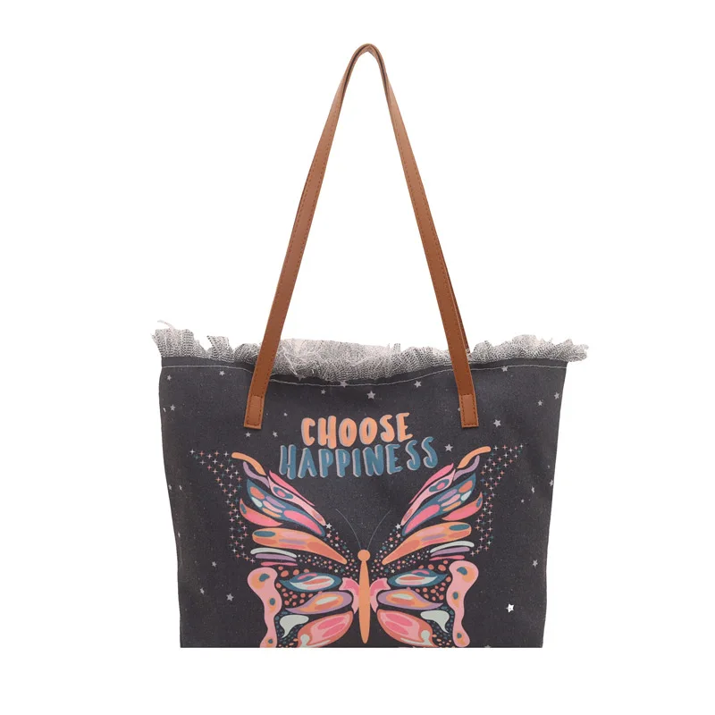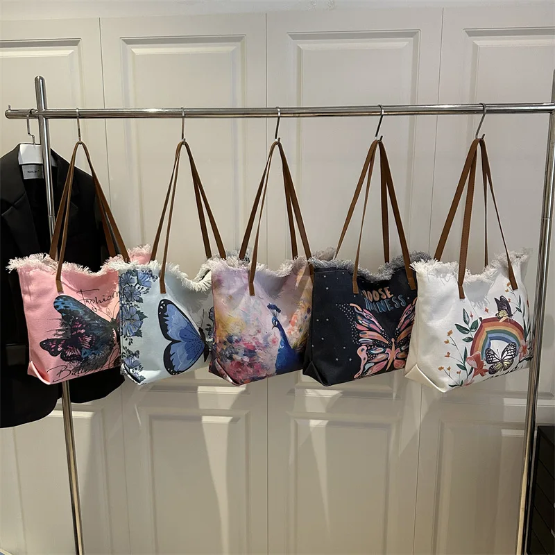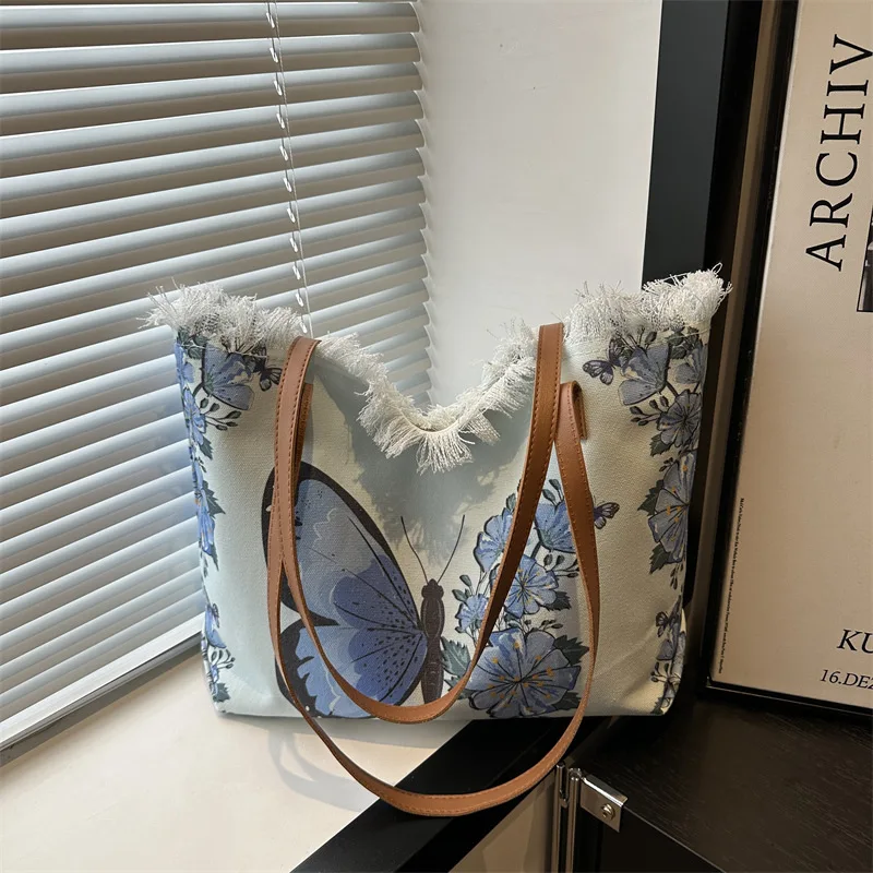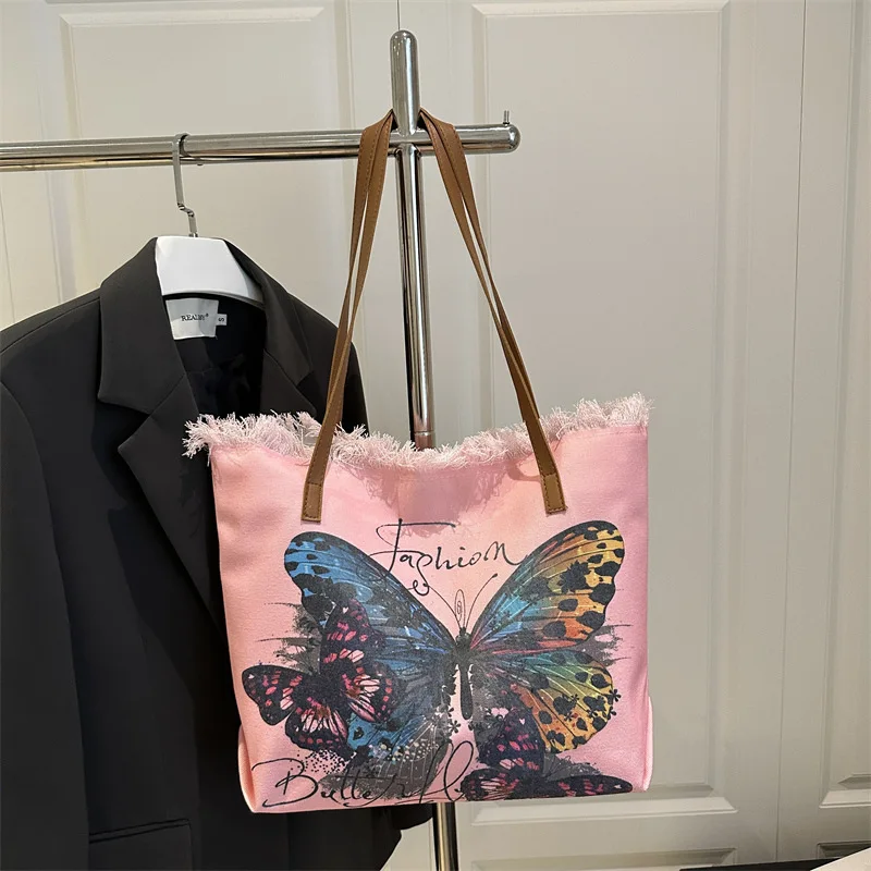 2026 New Fashionable Canvas Bag Butterfly Pattern Shopping Bag with Zipper Large Capacity Single Shoulder Tote Bag