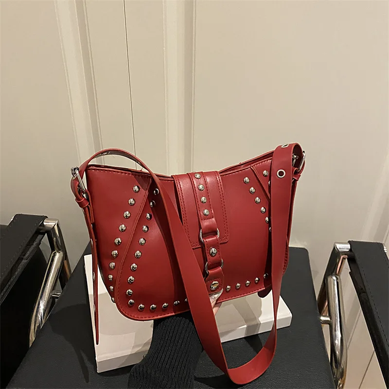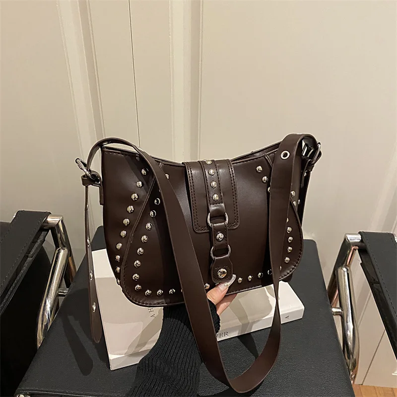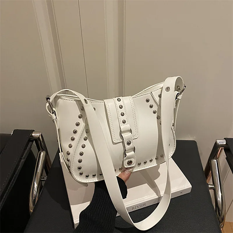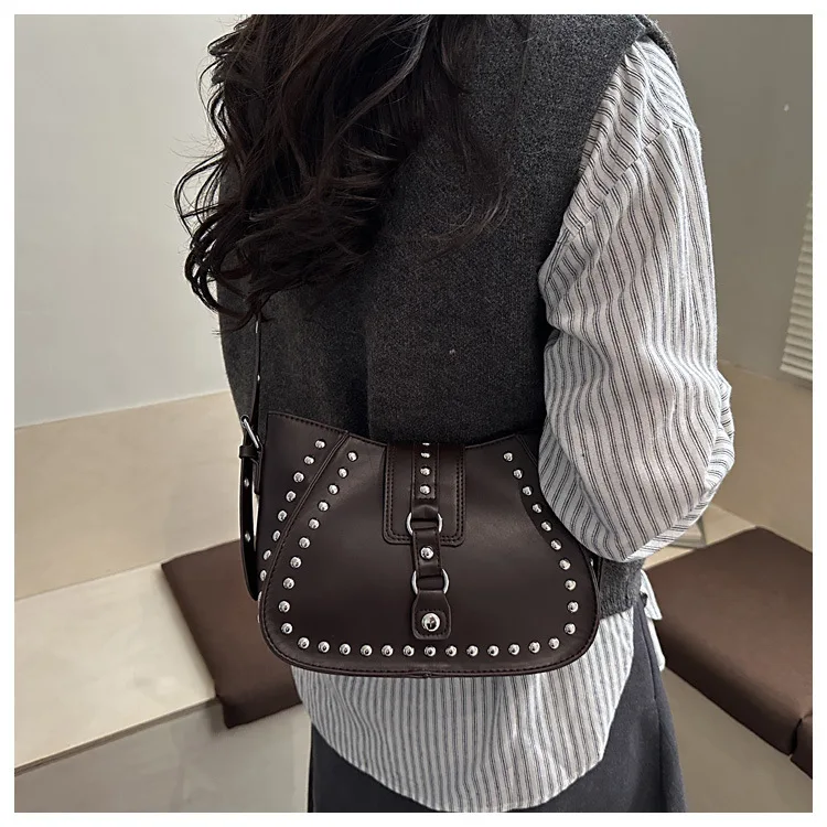 Solid Color Retro Motorcycle Shoulder Handbag Distinctive Rivet Casual Simple Portable Tote Women's Bag