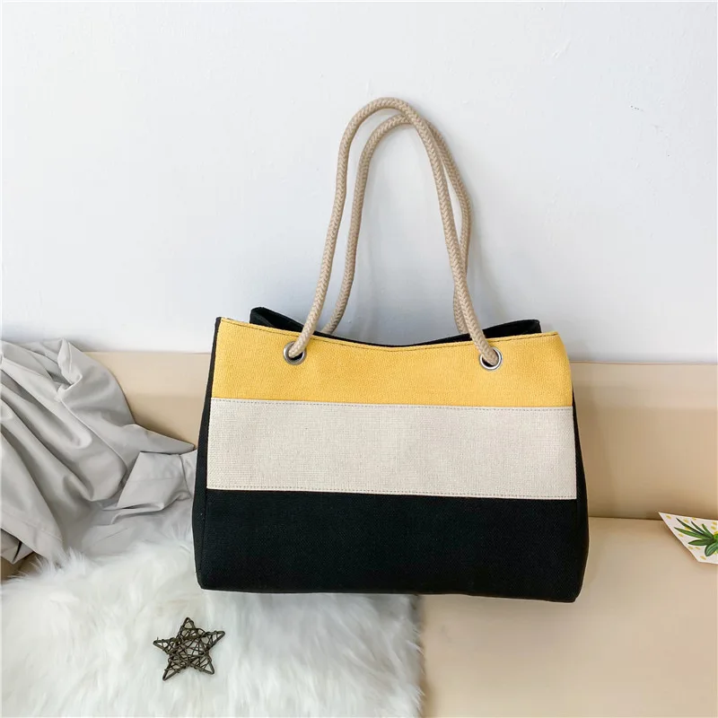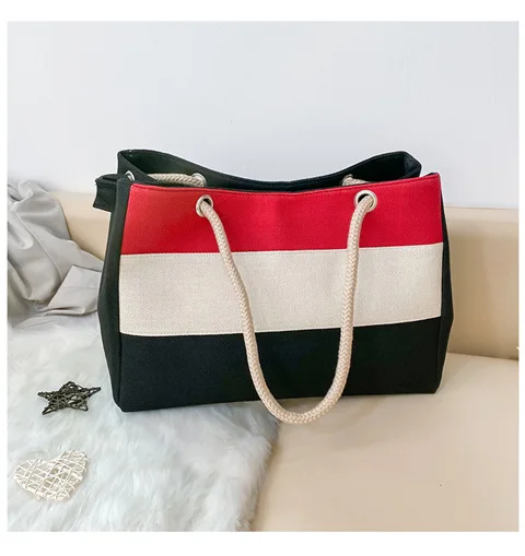 2026 New Korean Striped Fashionable Canvas Bag with Large Capacity, Simple and Versatile, Contrasting Color Handbag Tote Bag