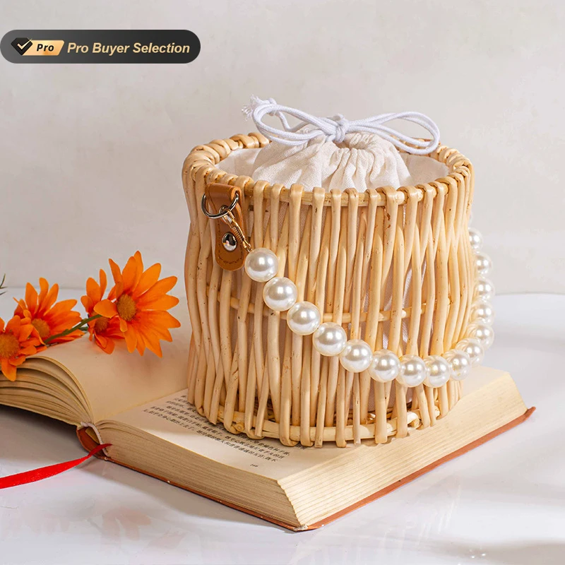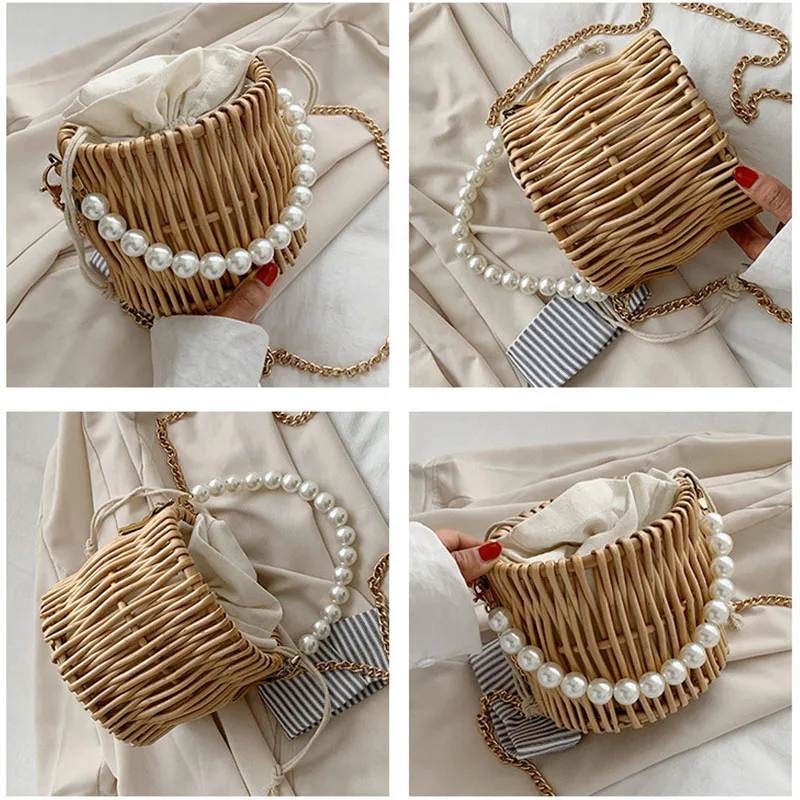 Round Woven Straw Bags for Women Summer Pearl Chain Handmade Rattan Beach Handbag Travel Bohemia Female Shoulder Crossbody Bag