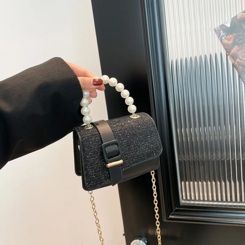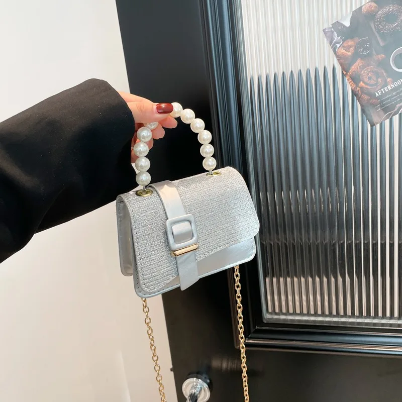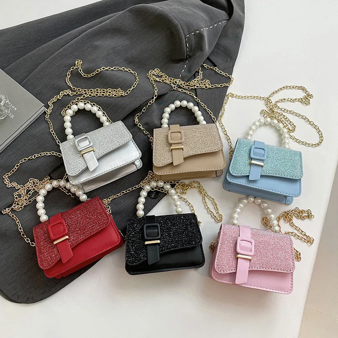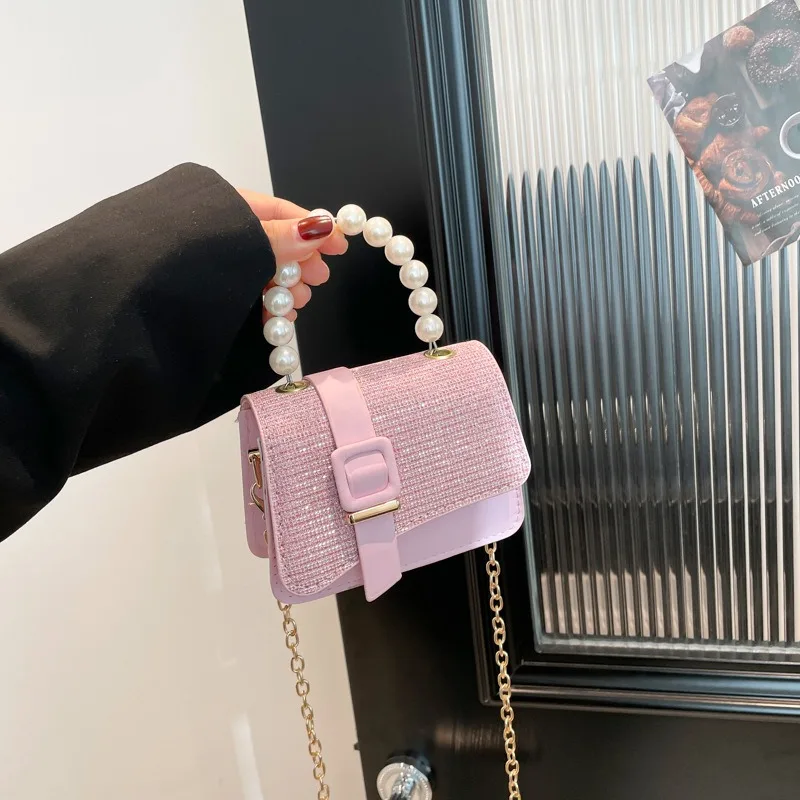 2026 New Arrival Bling Bling Pearl Handle Chain Small Square Bag For Baby Girls Children Mini Crossbody Bag