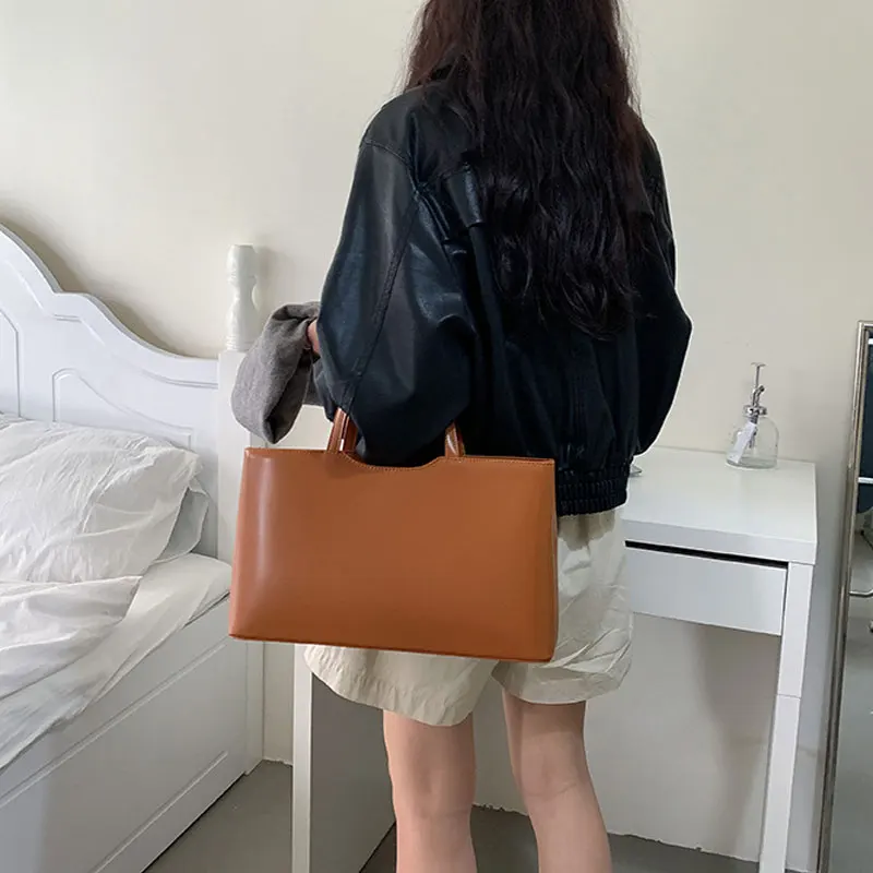 Simple and Fashionable Niche Tote Bag Rectangular Smooth Pu Leather Handbag Classic Solid Color Hand Bag for Women