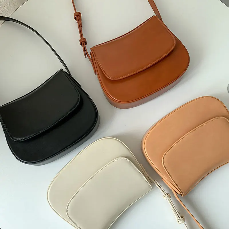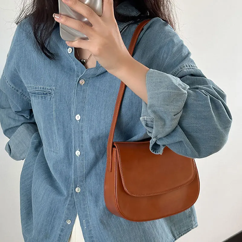 Customized LOGO Brown Handbag Pu Leather Adjustable Strap Shoulder Simple Half Round Flap Saddle Bag Ladies