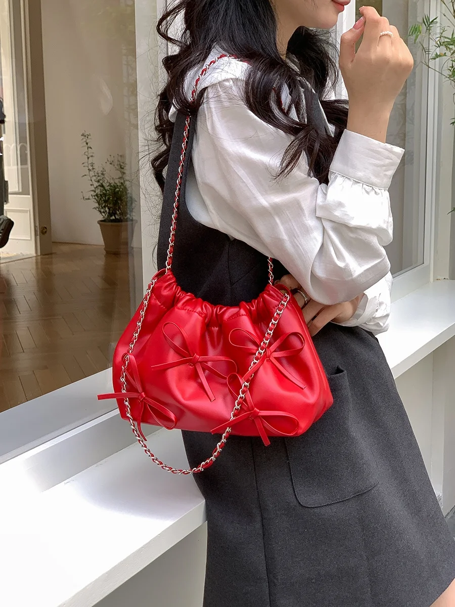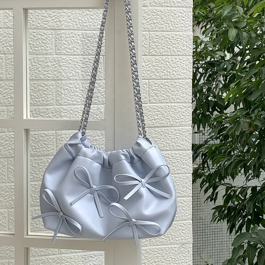 2026 Spring New Bow Design Chain Bag Cute High Quality PU Soft Leather Cloud Bag Large Capacity Crossbody Bucket Bag for Women