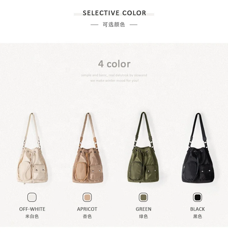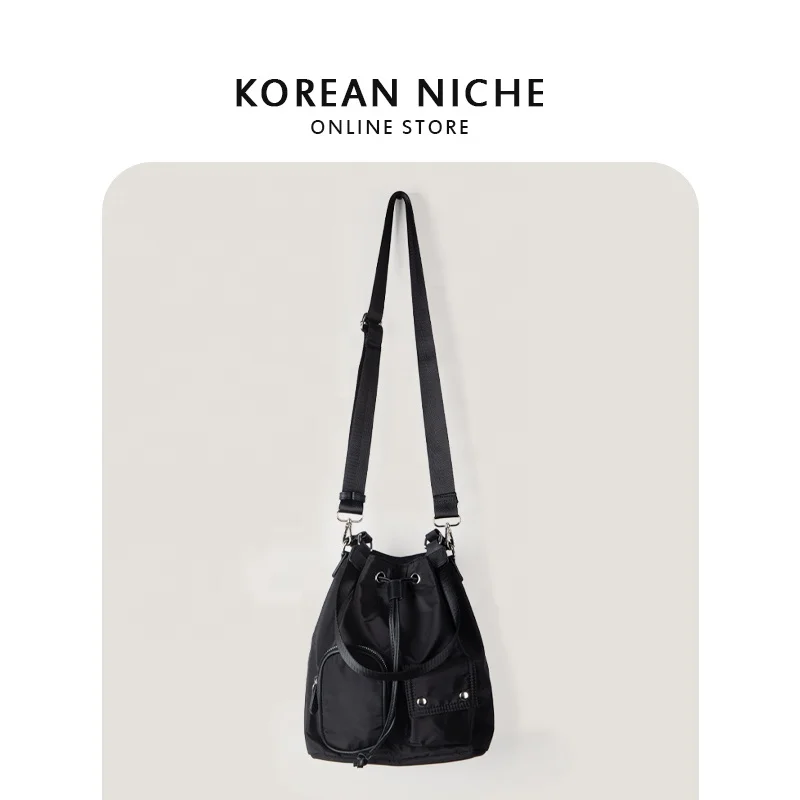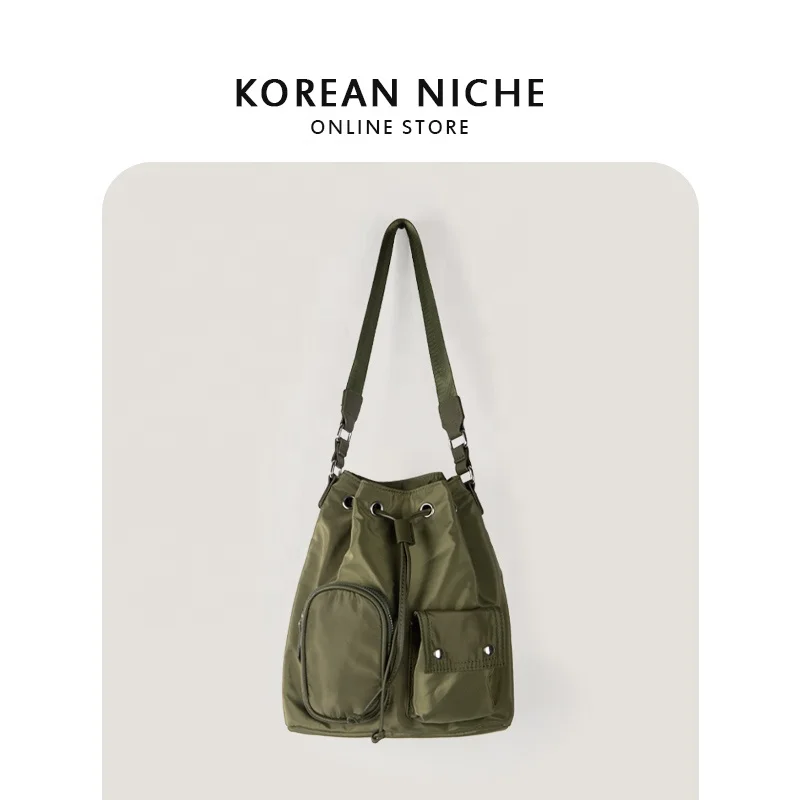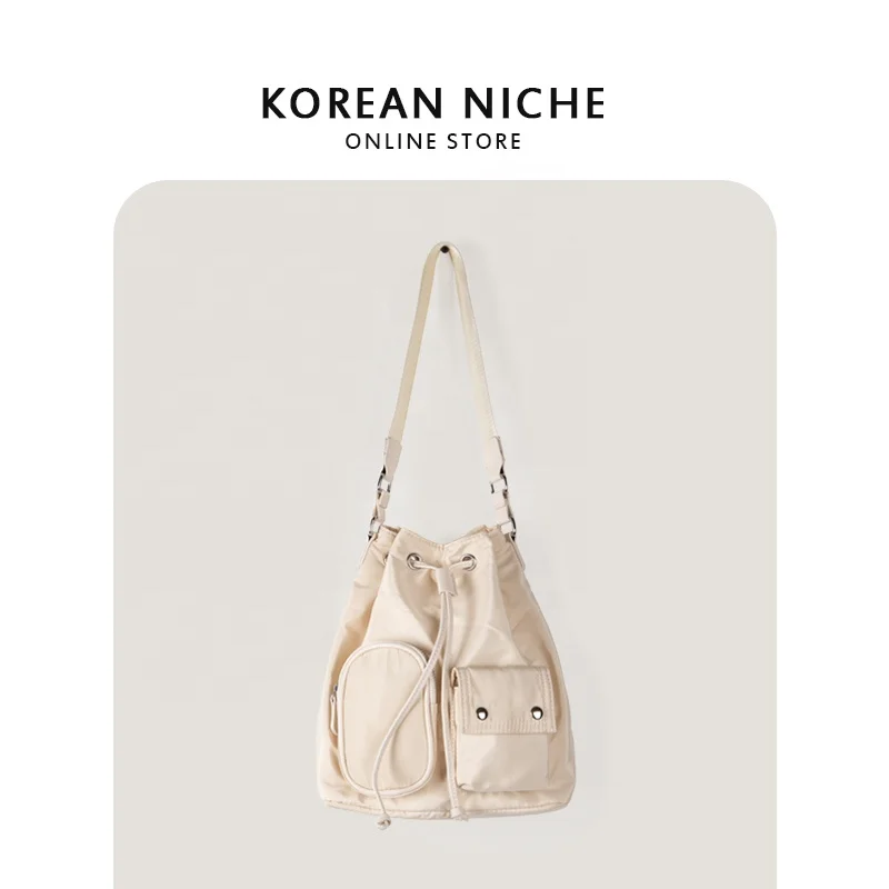 New Nylon Shoulder Bag External Pocket Cool Girls Nylon Tote Drawstring Design Bucket Bags for Women