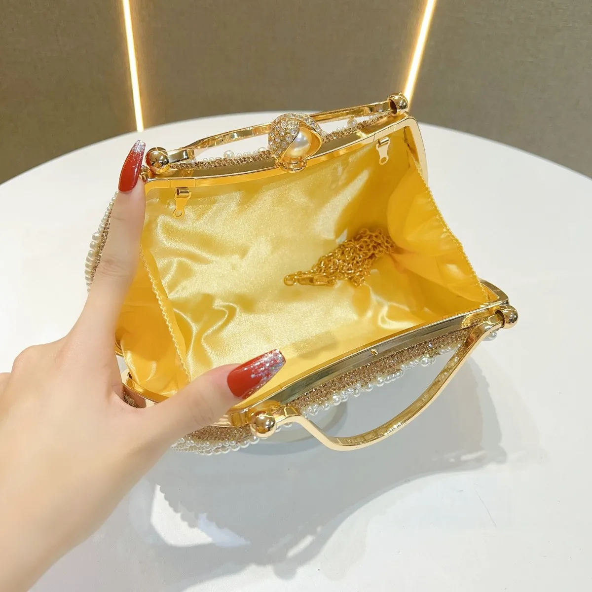 Women's Luxury Shoulder Bag Quilted Chain Shell Pearl Diamond Design Polyester Lining Mini Clutch Evening Bags Wedding Handbags