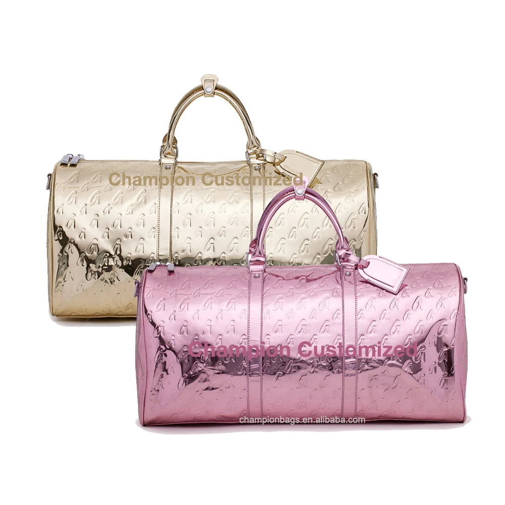 Custom Monogram Embossed Logo Metallic Leather Ladies Travel Weekender Overnight Duffle Bag for Women
