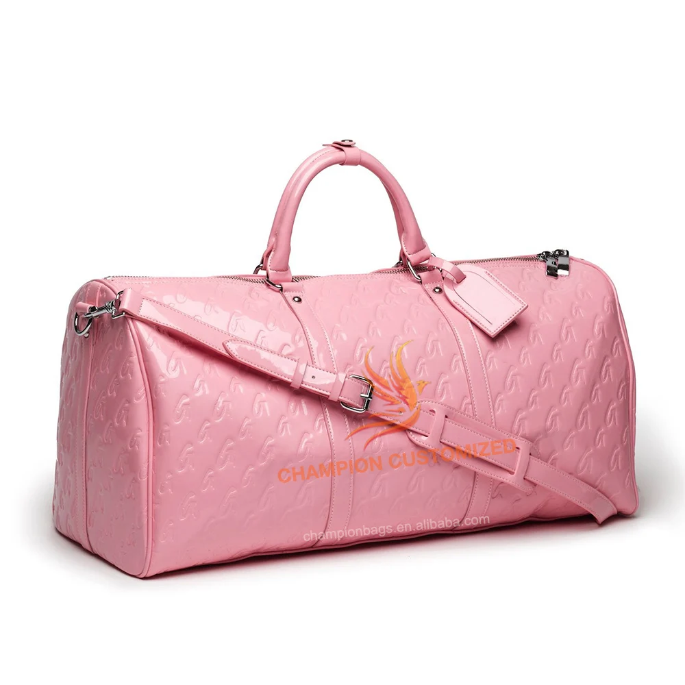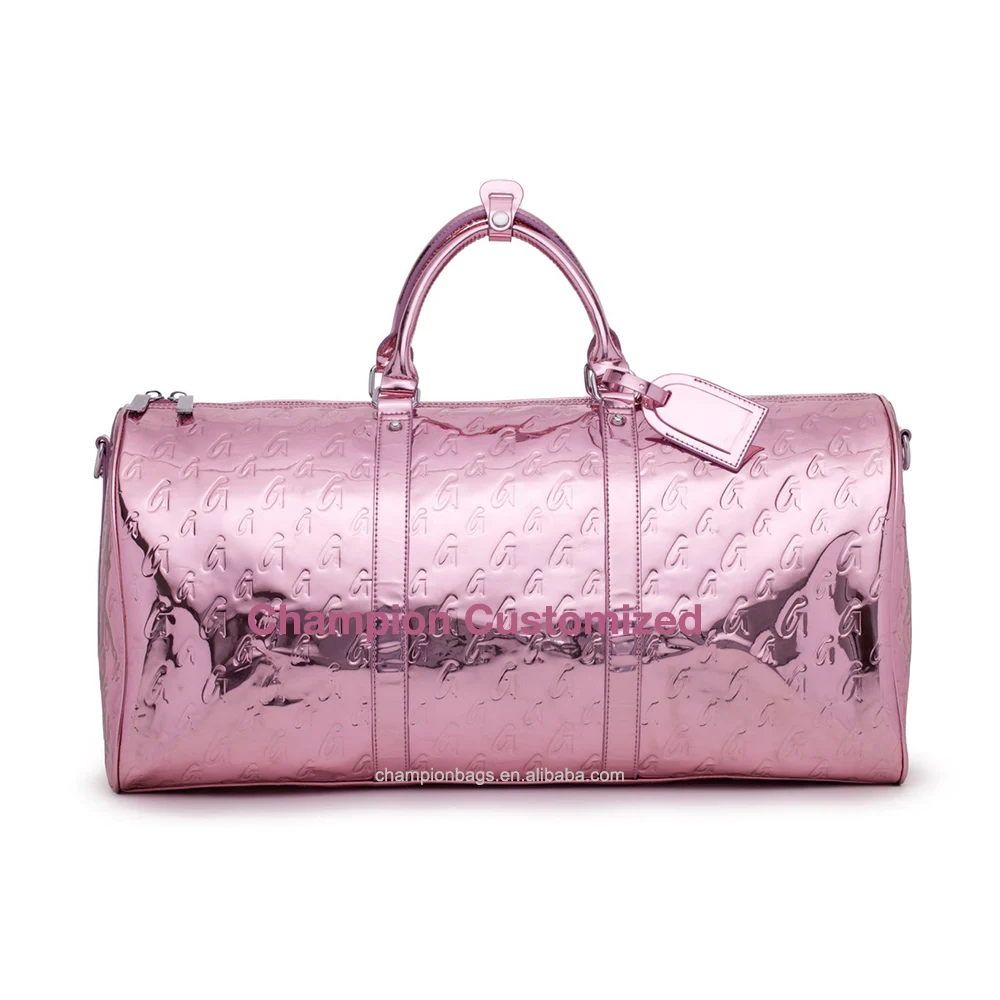 Custom Monogram Embossed Logo Rose Gold Metallic Leather Ladies Travel Weekender Overnight Duffle Bag for Women