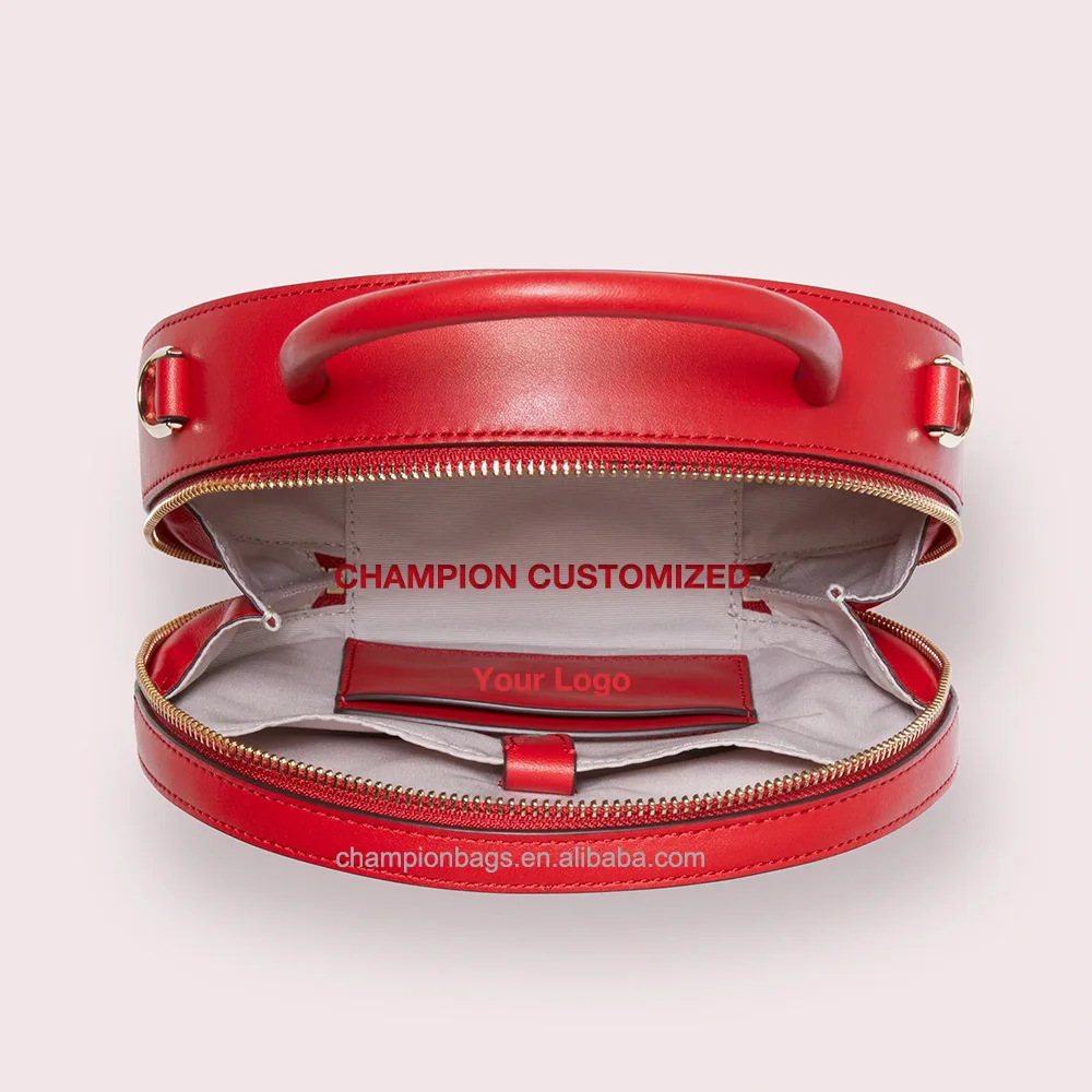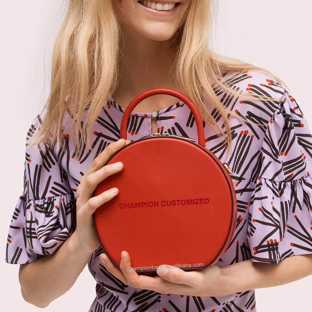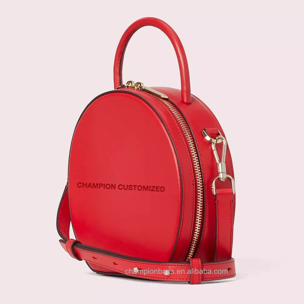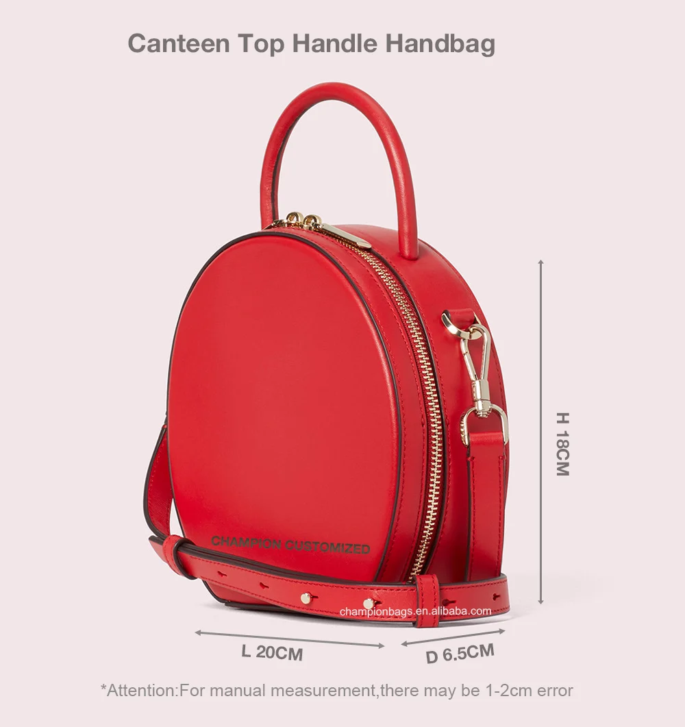 Custom Logo Red Smooth Leather Canteen Round Shape Satchel Bag Ladies Classic Crossbody Women Handbag Purse
