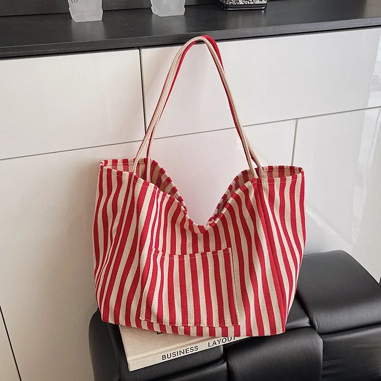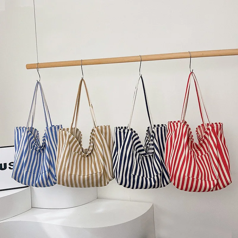 Custom Ladies Stripes Canvas Shoulder Bag Big Capacity Striped Shopping Tote Bag Versatile for Autumn Winter Spring