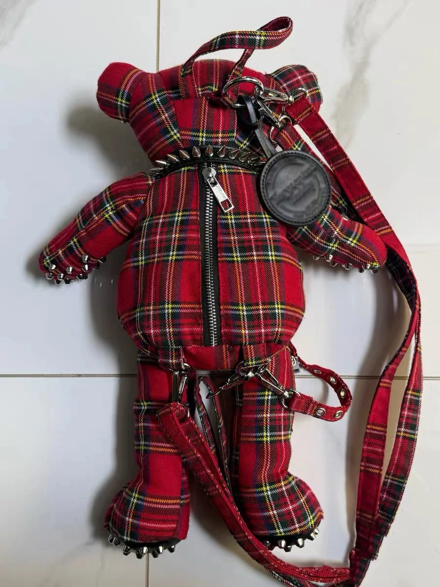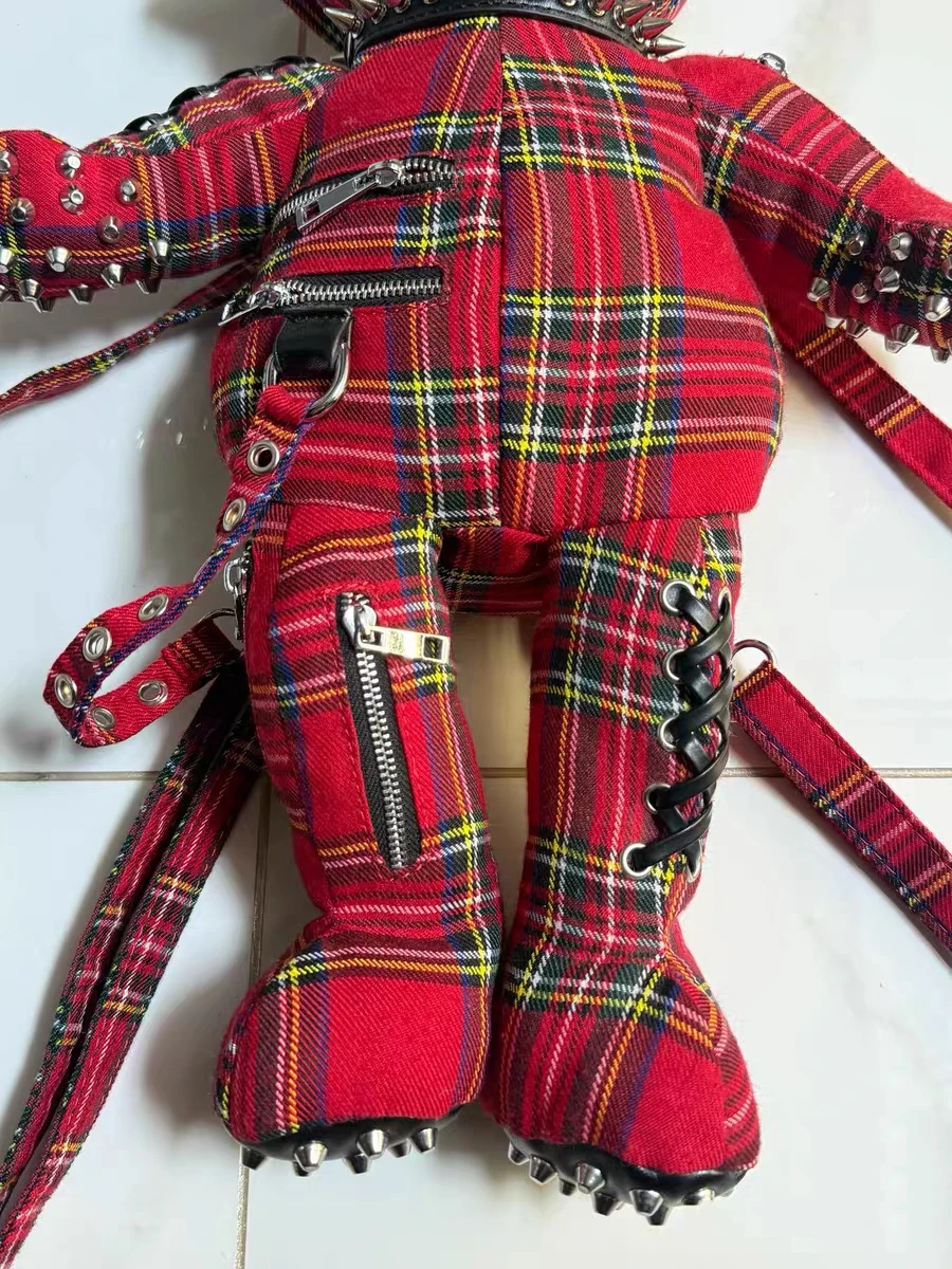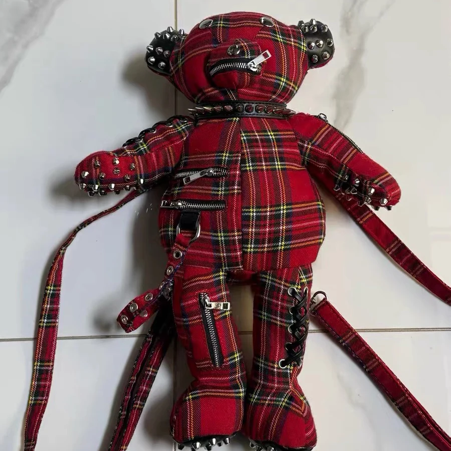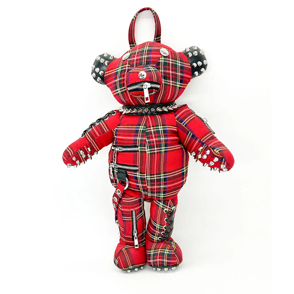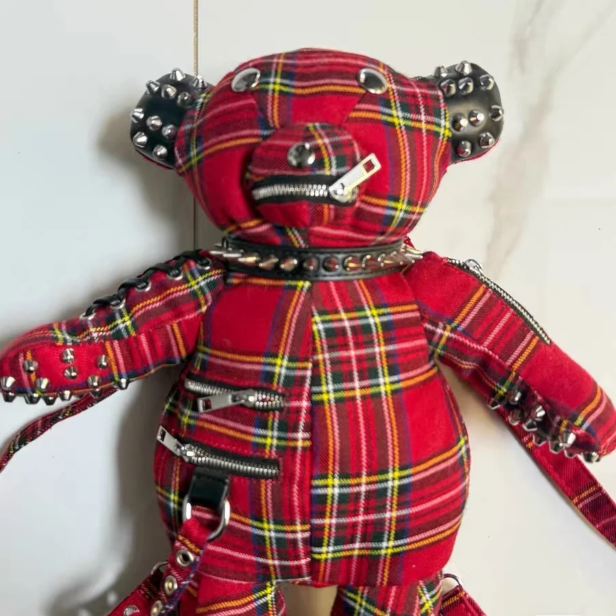Customized 3D Plush Cartoon Bag Black Plaid Punk Bear Backpack Punk Star Patch Leather Little Bear Bag