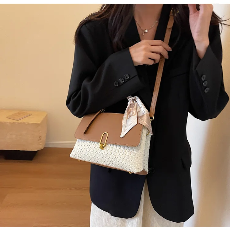 2026 New Plaid Simple Shoulder Messenger Bag for Women Fashion Woven Underarm Bag With Silk Scarf Casual Handbag