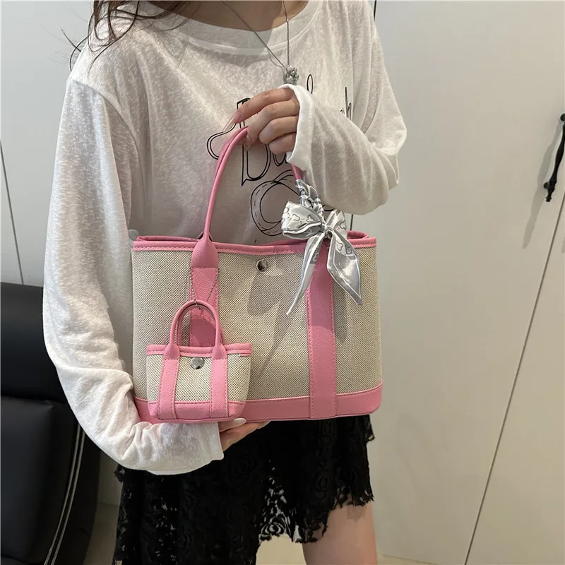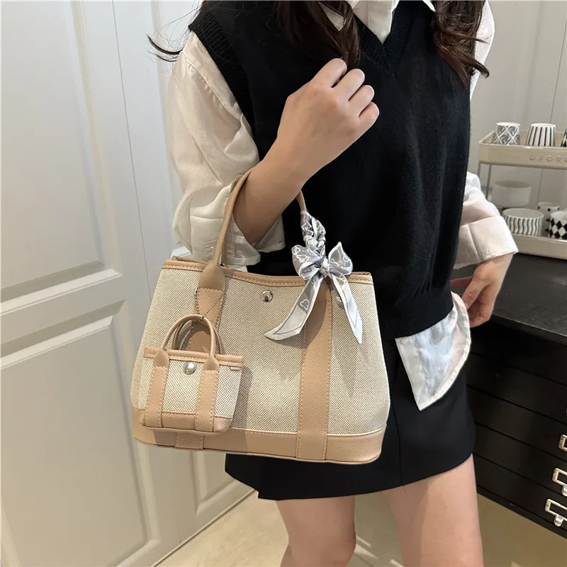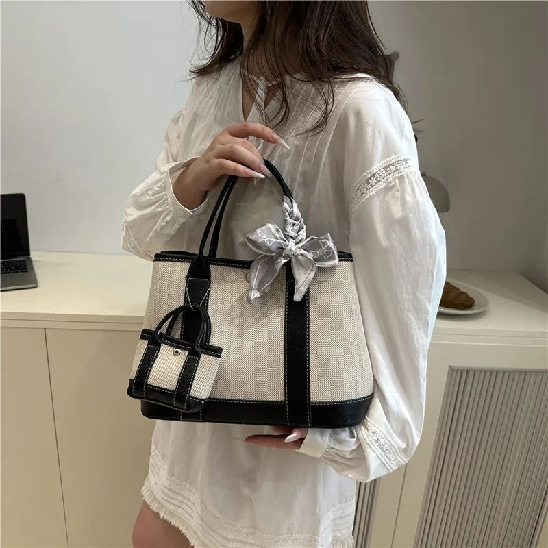 2 in 1 Set Handbags Top Handle with Scarf Decoration Luxury Handbag Large Tote Bag Canvas Shoulder Bags Purse for Lady