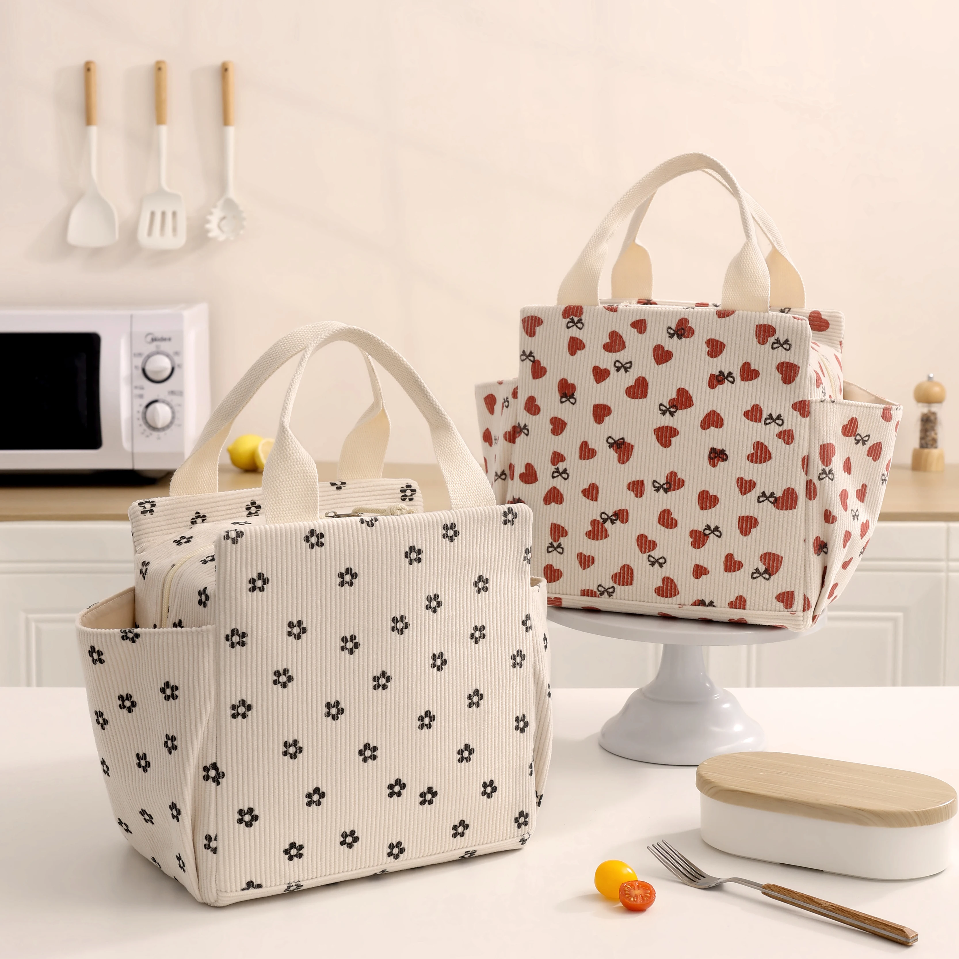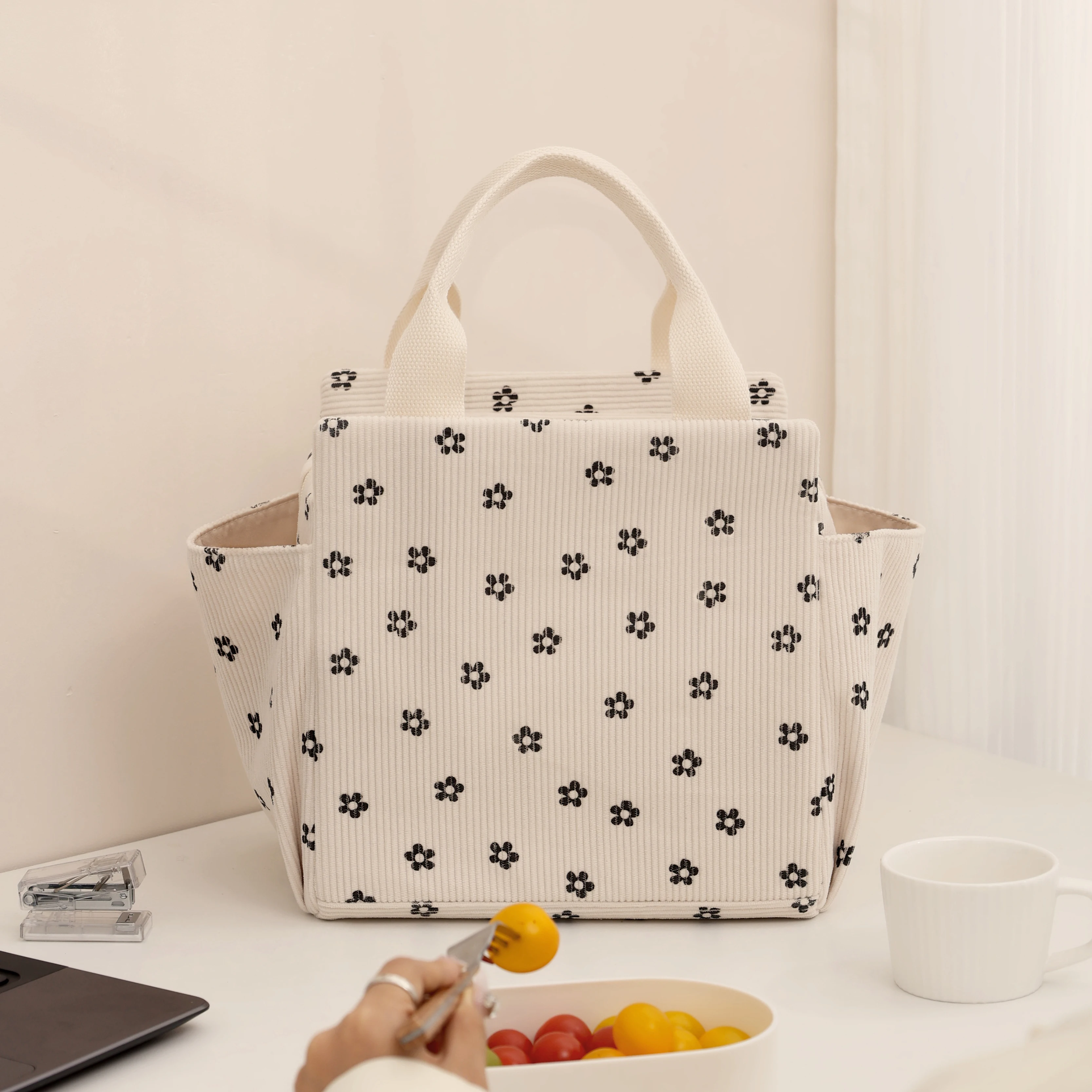 New Large Side Insulated Corduroy Square Meal Bag Thermal Lunch Bag Portable Thermal Bag
