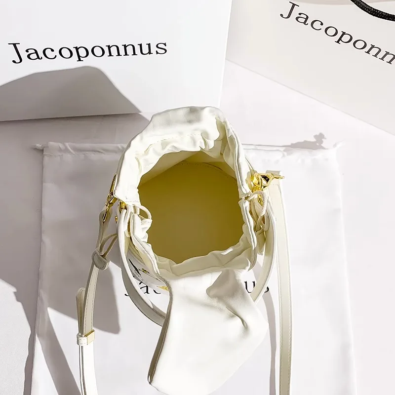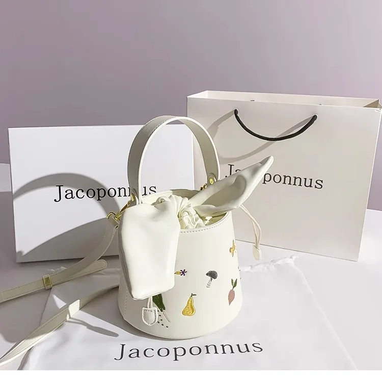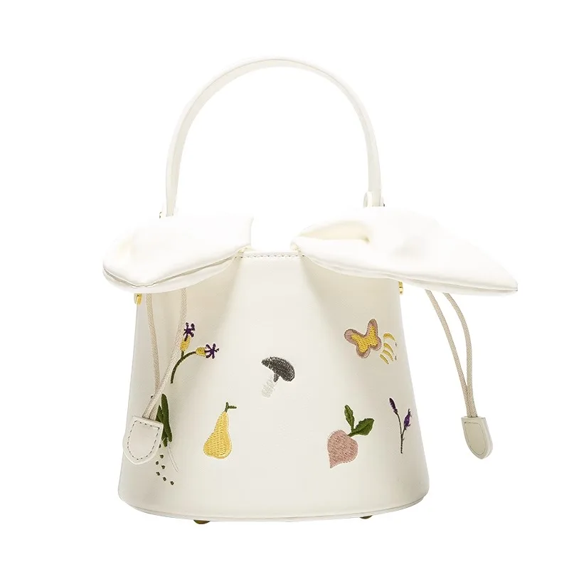 New Arrival Luxury Women's White PU Leather Bucket Bag Fruit Print Embroidery Shoulder Bag Fashion Design for Summer