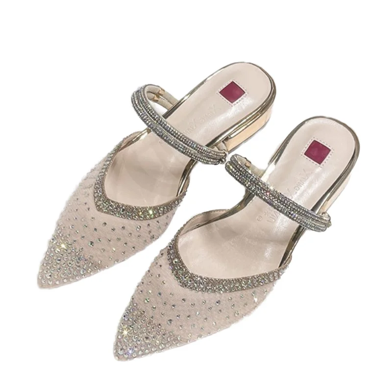 Champagne Luxury Block Heels Women's Mesh Pumps Size 31-43 3CM Low Pointy Toe Slip-On Anti-Slippery Disposable EVA Summer