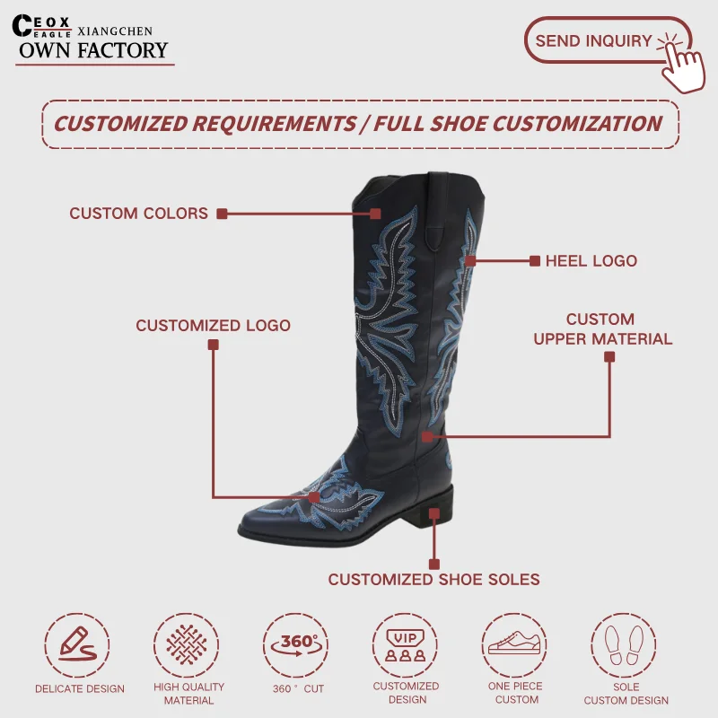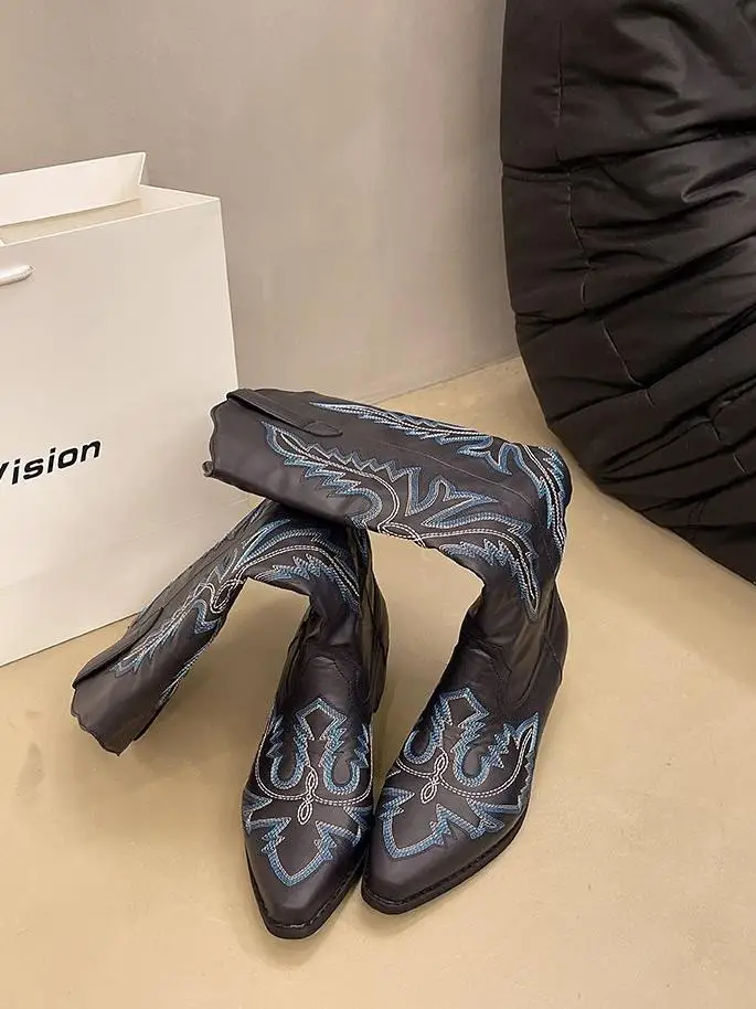 2026 Women's Extra Large Knight Boots Embroidered Square Heel New Design Inspired Cowboy Casual Thick Bottom Height Increasing