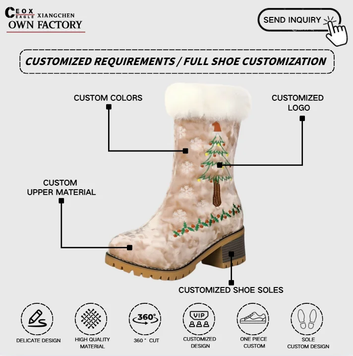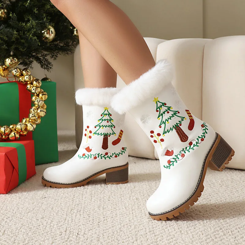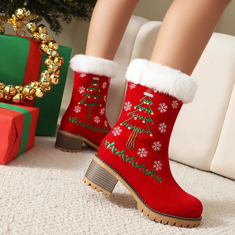 Women's Snow Boots Red Christmas Embroidered Thick Fur Lining Chunky Heel Thick Sole Slip-On Closure Short Boots Warm
