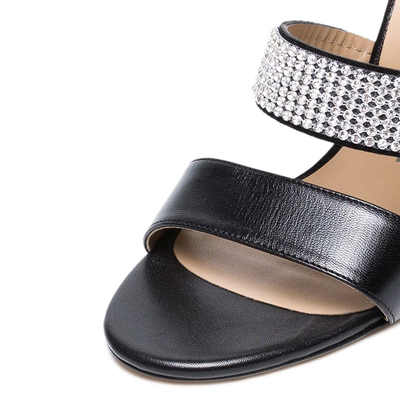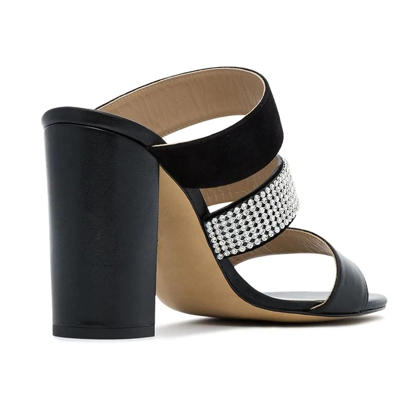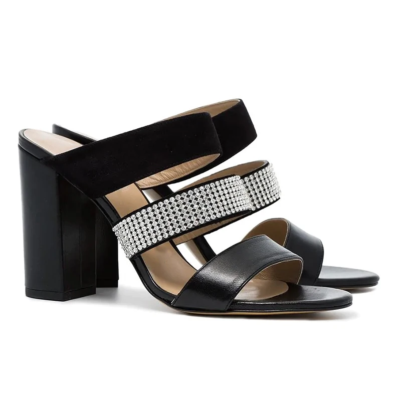 2022 Plus Size Black PU Leather Crystal Thick Heel Chunky Mules Woman High Heels Sandals for Ladies