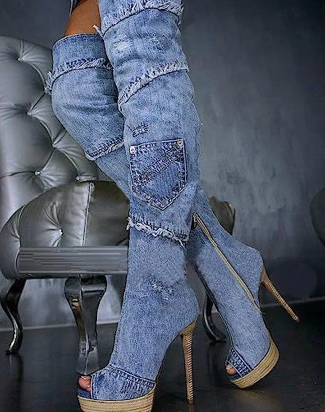 Fashion Zipper Wedge Stiletto Platform Over the Knee Girls Boots Stretchable Denim Peep Toe Pointy Toe Long Boots