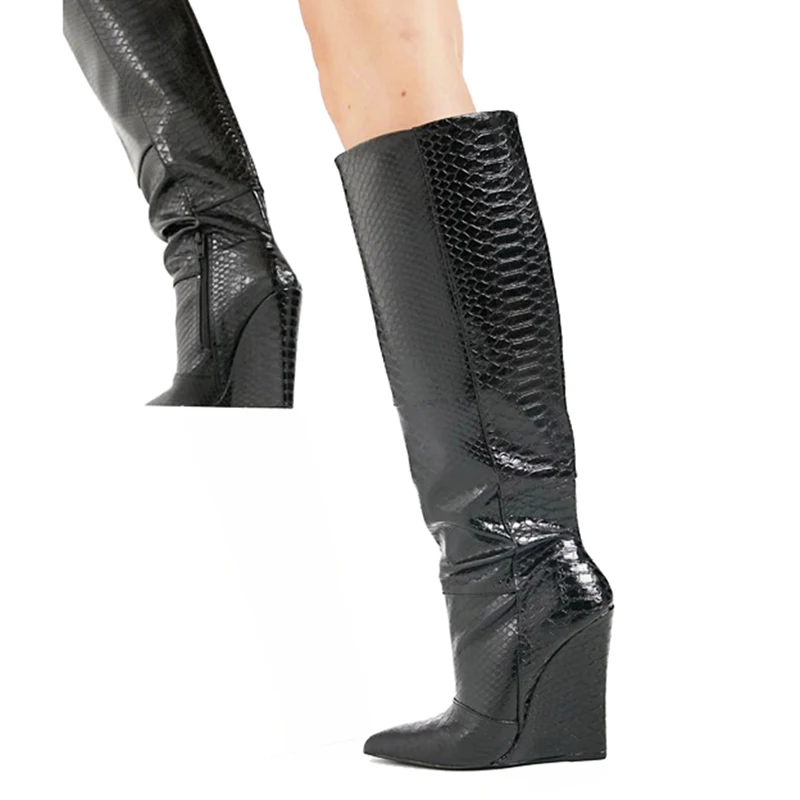 2022 Winter New Arrival Black Crocodile Pattern Boots Wedges Heel Knee High Boots