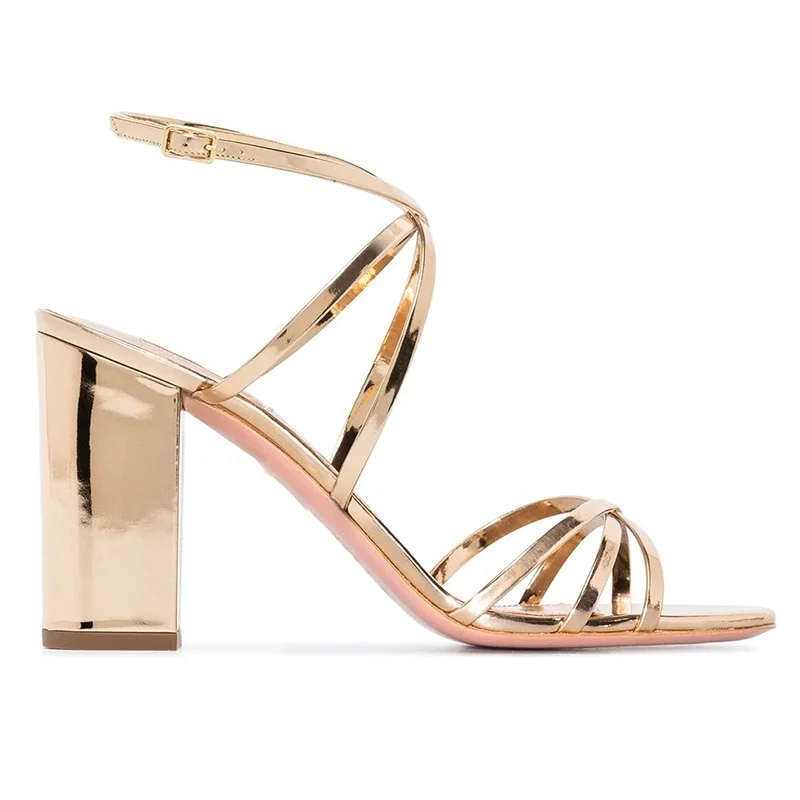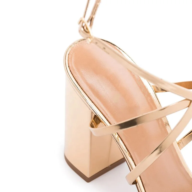 2020 Latest Women Chunky High Heel Gold Strappy Party Dress Summer Sandals
