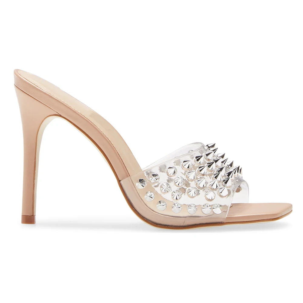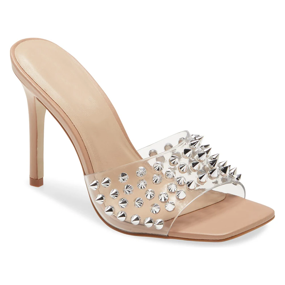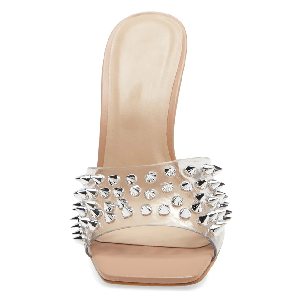 Silver Studs Mules Square Toe High Heel Summer Clear PVC Women Sandals 2022