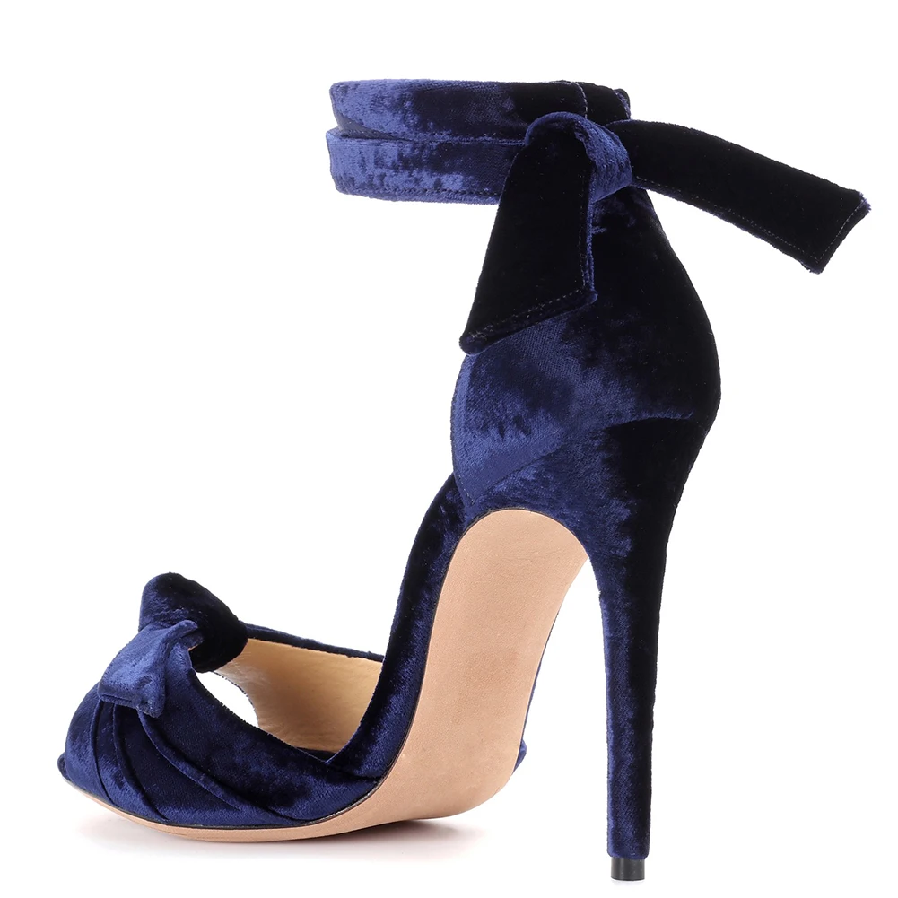Evening Dress Heeled Sandals Ankle Wrap Lace up Summer Party High Heels Peep Toe Knotted Velvet Women Shoes