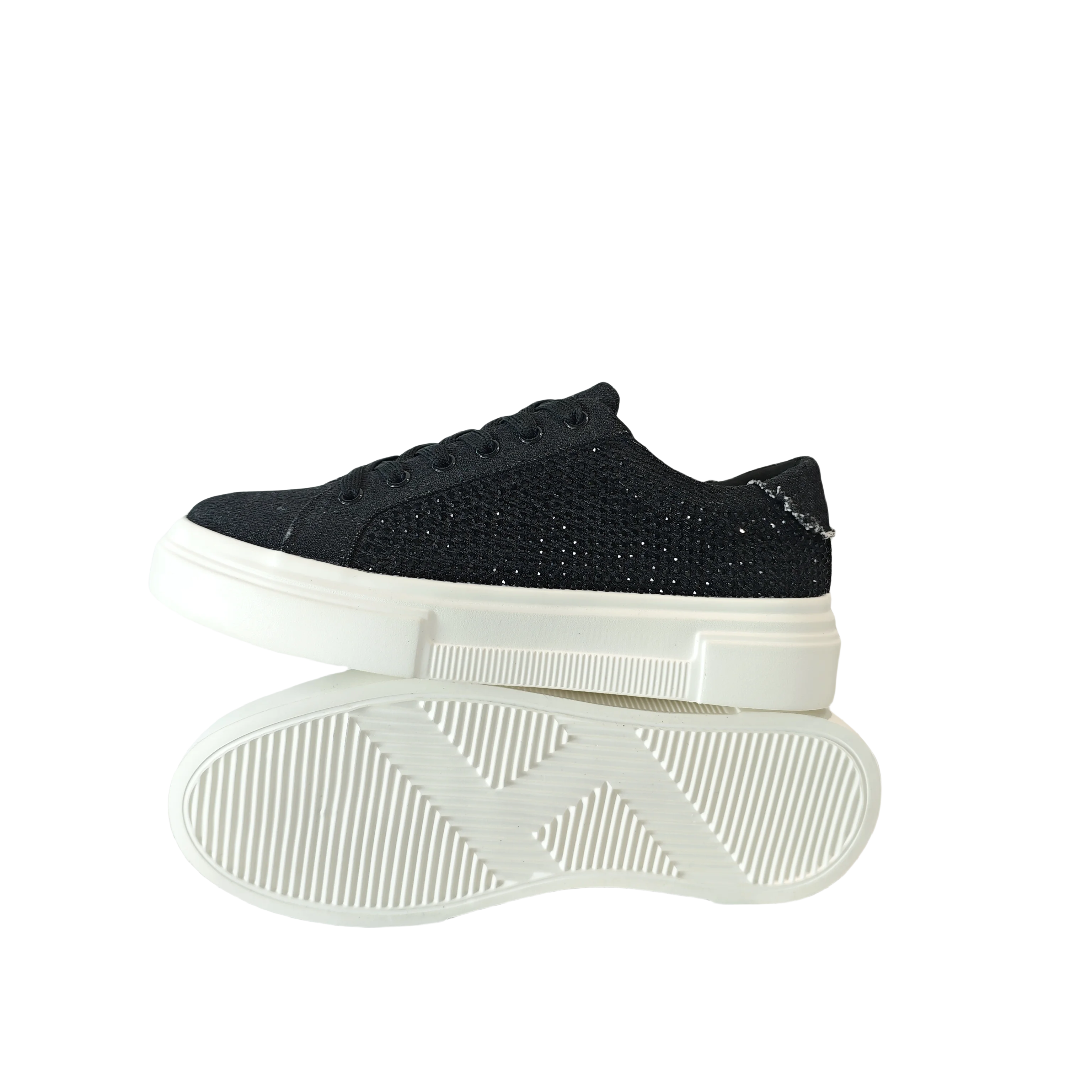 Unisex Fashion Casual Sneakers Black Shining Rhinestones Lace-Up Board-Shoes Flat Sole Breathable Slip-Resistant Walking Style