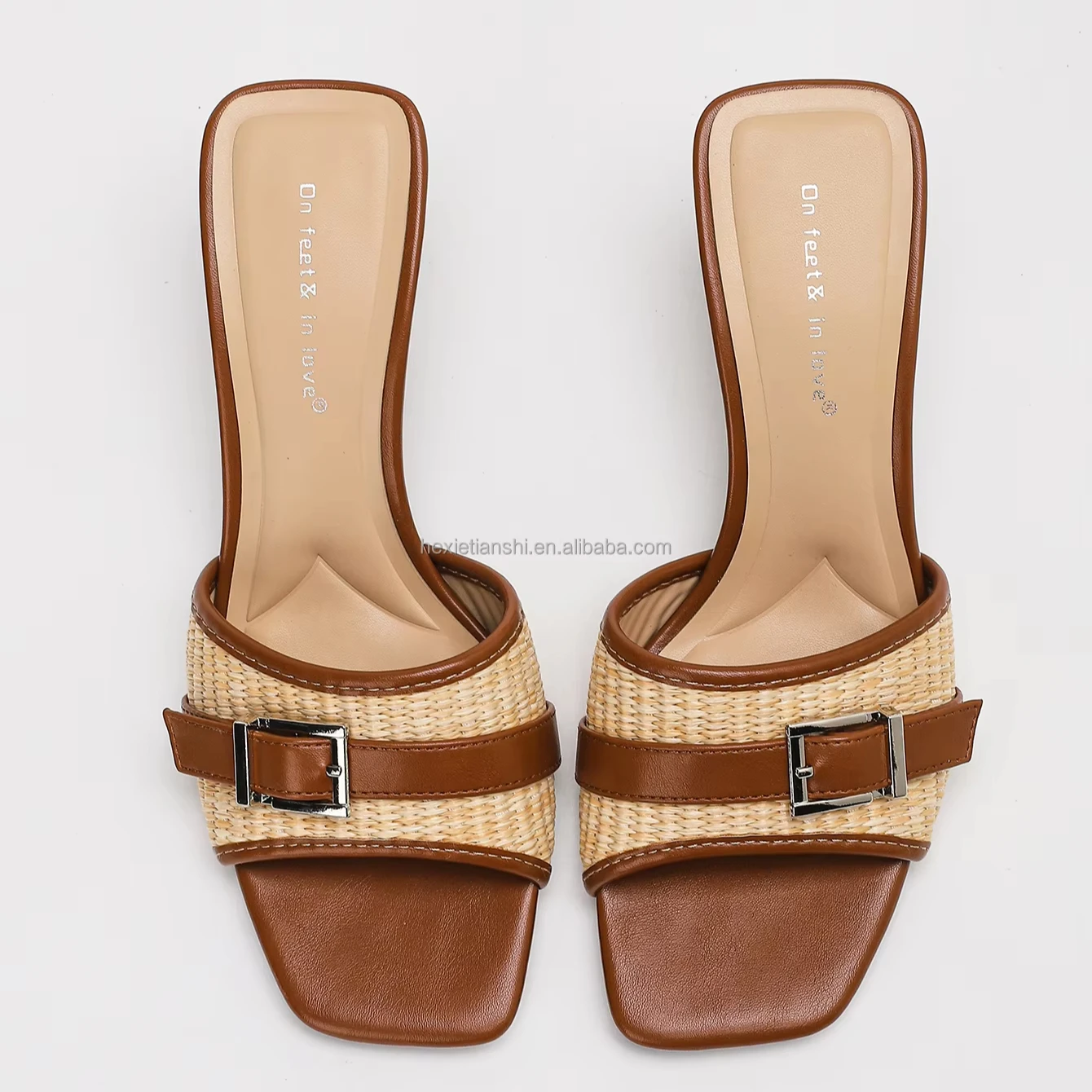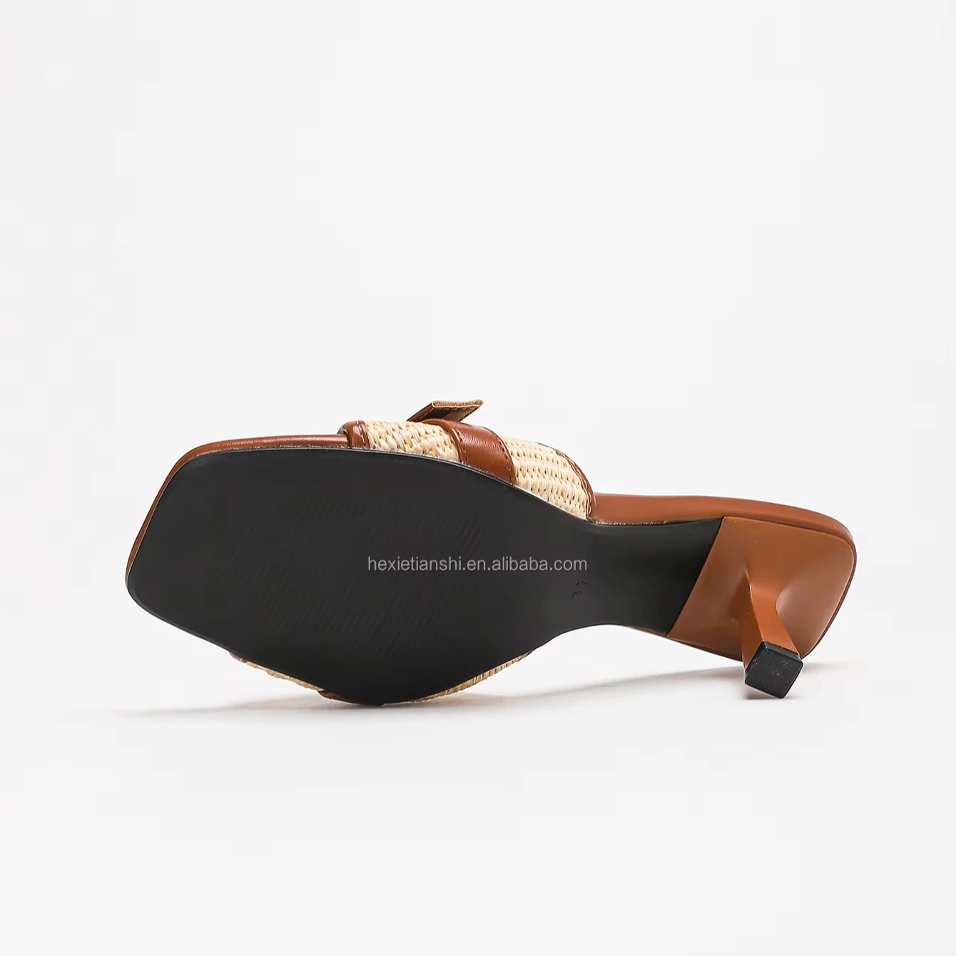 1828-13 Summer Fashion Woven square Toe High-heeled slippers Women Open Toe Elegant Slids Sandals with Thin Heels