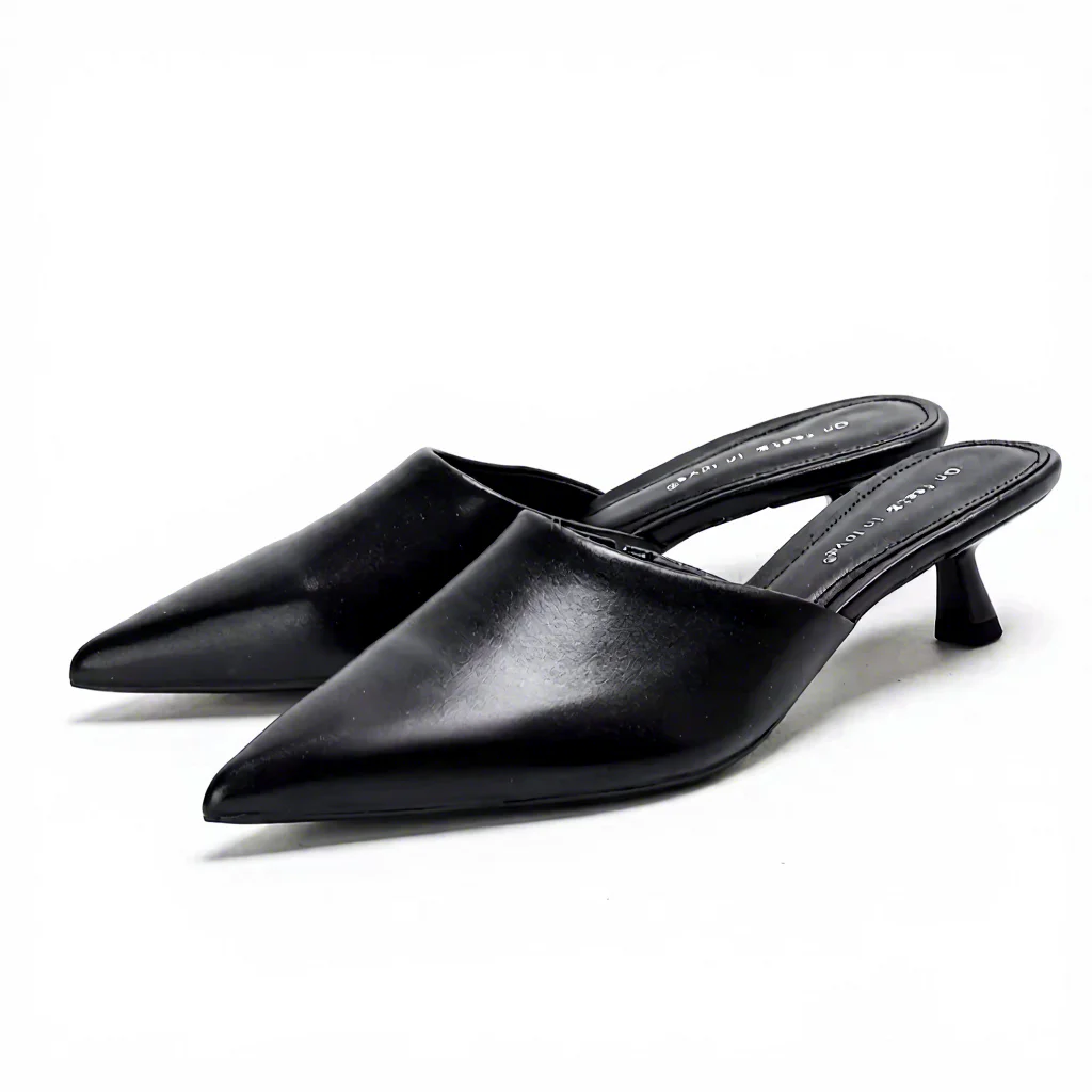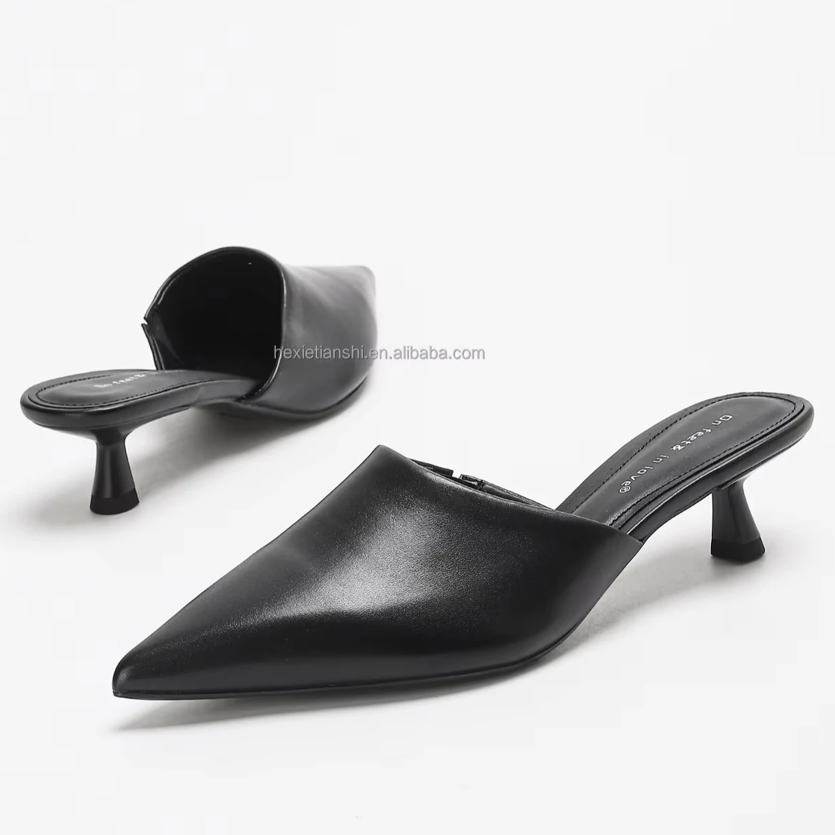 1702-9 Women's High Heeled Mule Sandals Autumn New Pointed Toe Mule Heel Shoes Simple Style Solid Black Slides for Spring