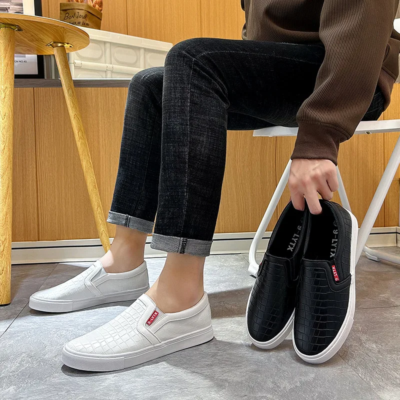 Slip-On Lazy Shoes Men's Casual Artificial Leather Shoes Work Student Skate Korean Style Pure White Elastic Stripes All