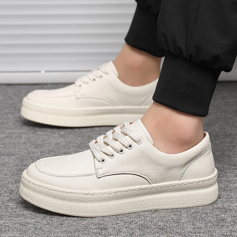 2026 New Genuine Leather Men's White Lace-Up Sneakers Trendy Versatile Casual Durable Height-Increasing Thick-Soled Shoes