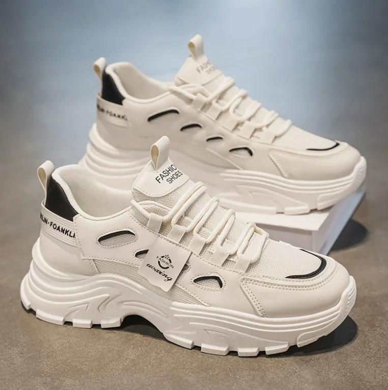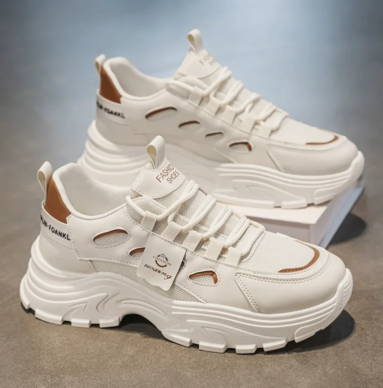 Whale Will Men's Autumn Breathable Cotton Mesh Solid Color Thick Bottom White Sports Casual Shoes