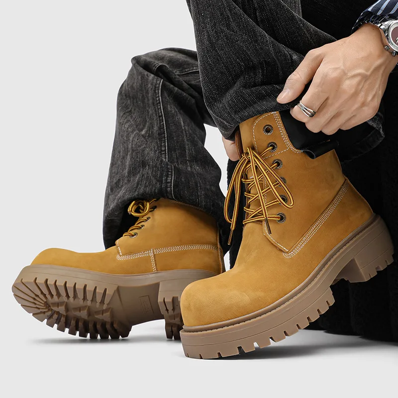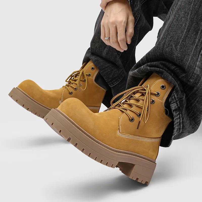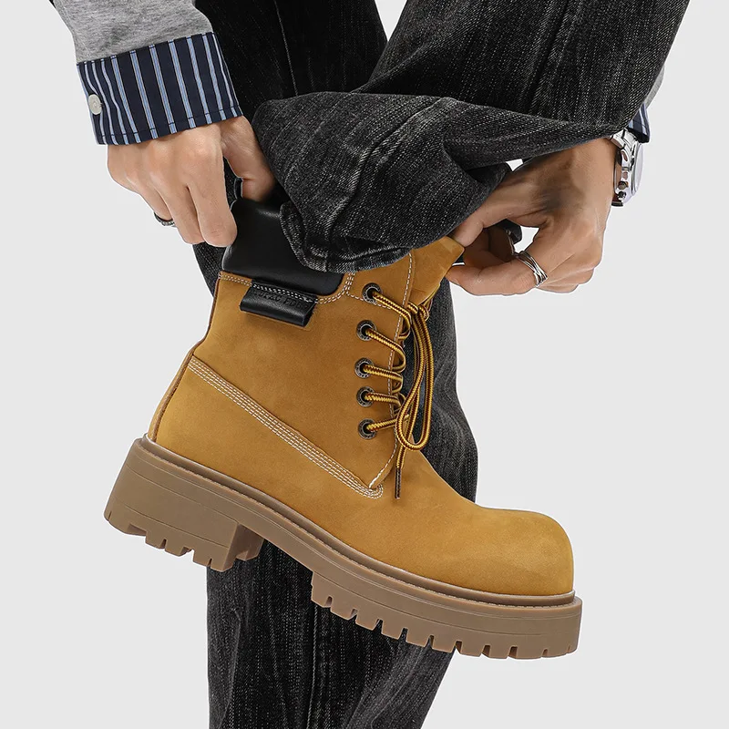 Men's Yellow Mid-Calf Casual Thick-Soled Work Shoes Height-Increasing Lace-Up Boots