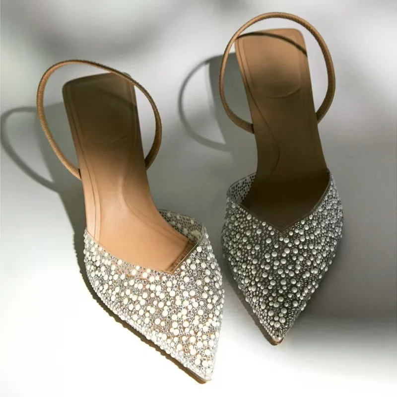 New Summer High Heel Sandals With Pointed Tip Fine Heel Shallow Mouth Rear Hollow Pearl Decoration Strap Back Women's Sandals