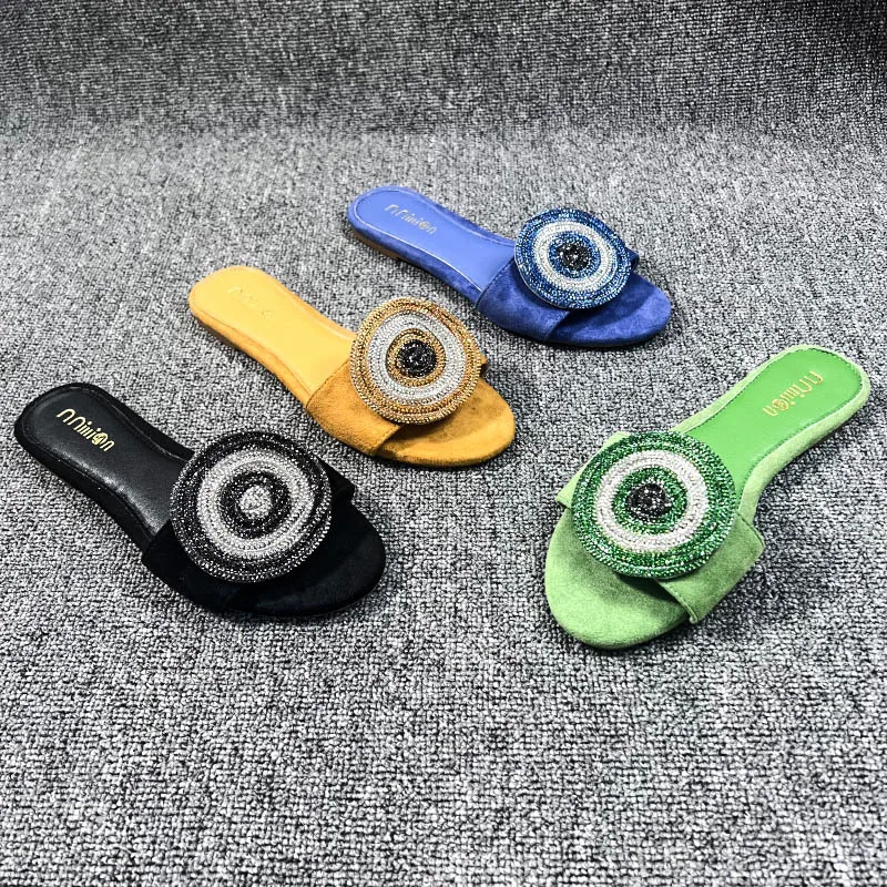 New Summer Women's Shoes Senior Sense of Fashion Rhinoline Suveled Outside Wear Flat Bottom One Word Cool slippers