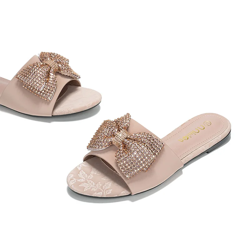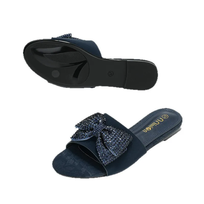 Summer Outside Wear Rhinestone Bow Flat slippers Exposed Toe High Sense Fashion Light Luxury Female Sandals