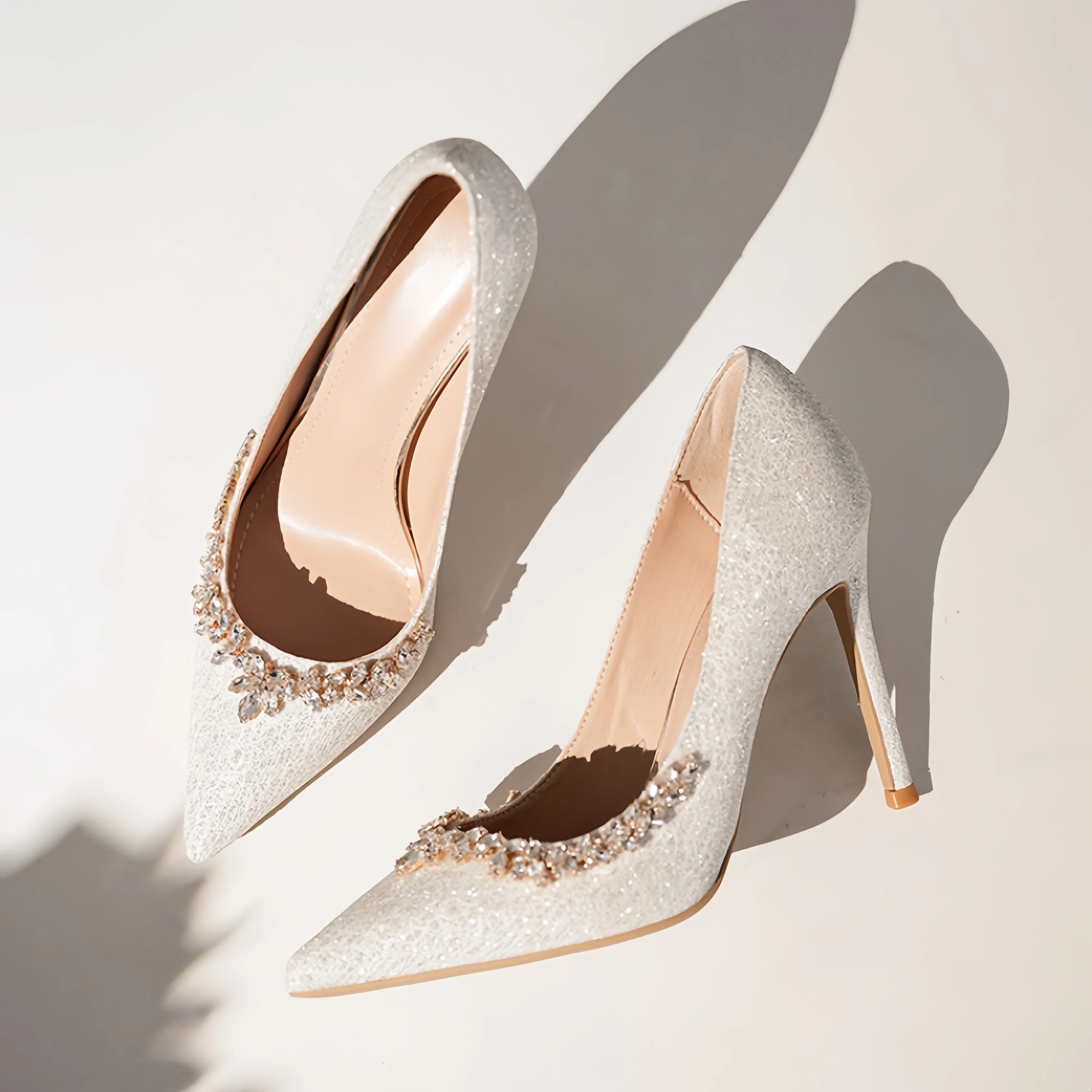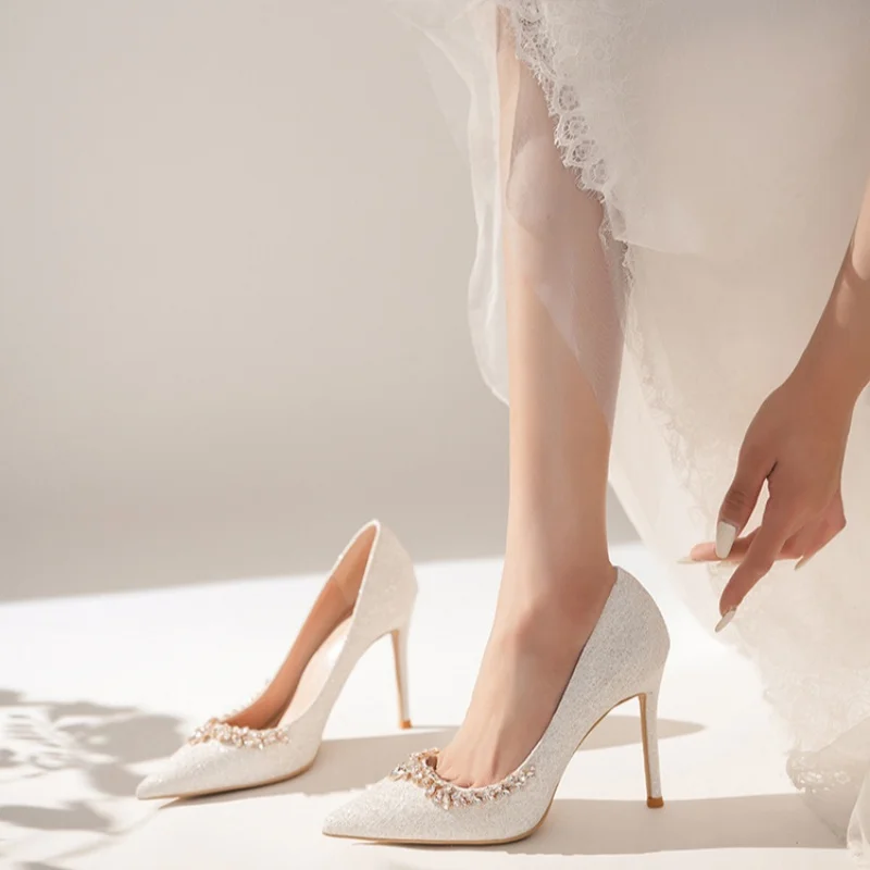 2026 New French Elegant White Crystal High Heels Noble Fine Pointed Head Shallow Mouth Diamond Edge Thin Heels Rhinestones