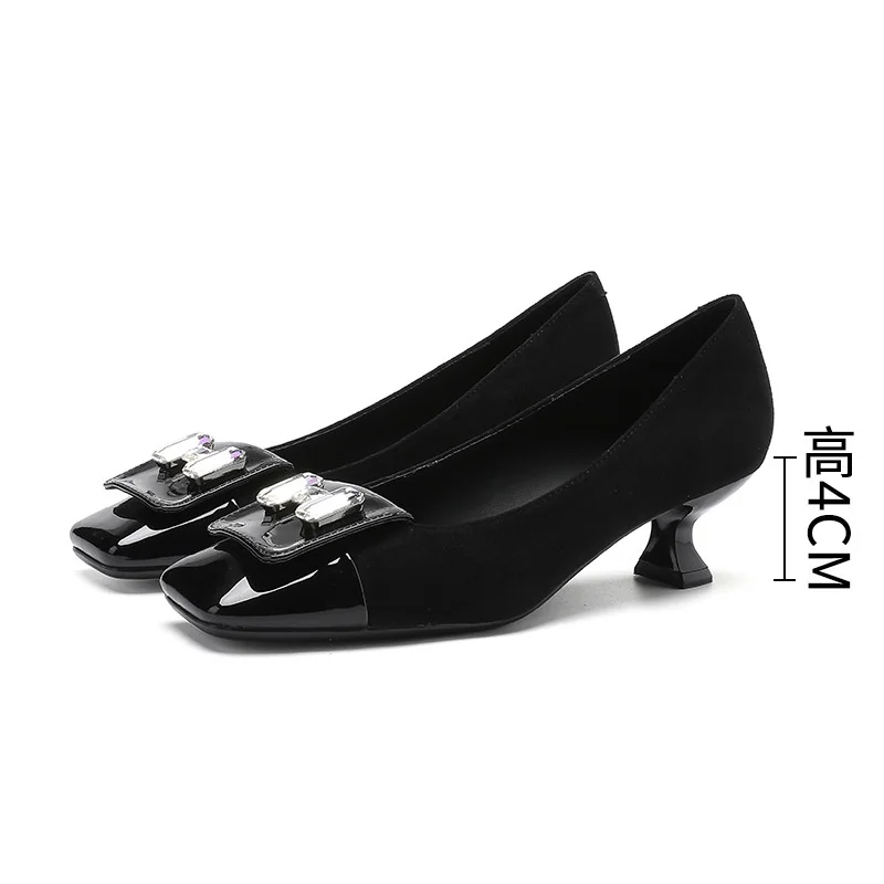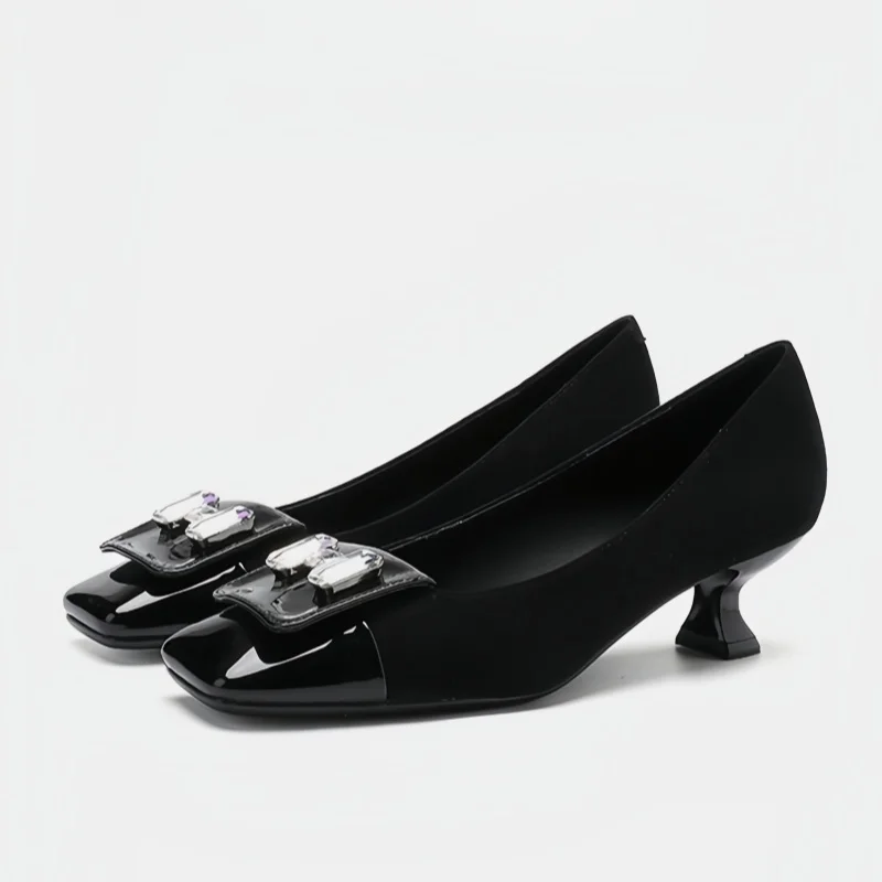 Black Real Leather Square Toe Mid Block Heels Working Pumps High Quality Single Buckle Comfortable Breathable Heeled Sandals