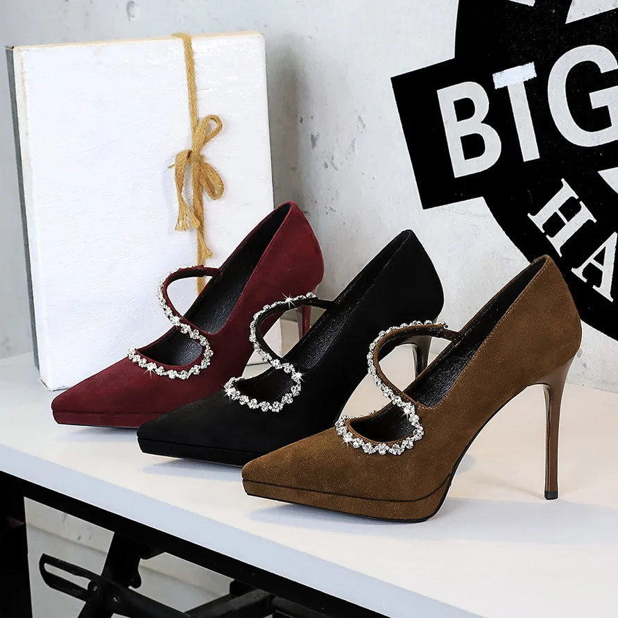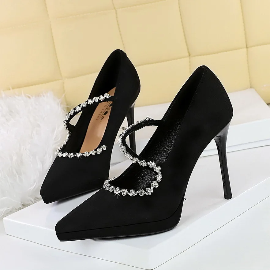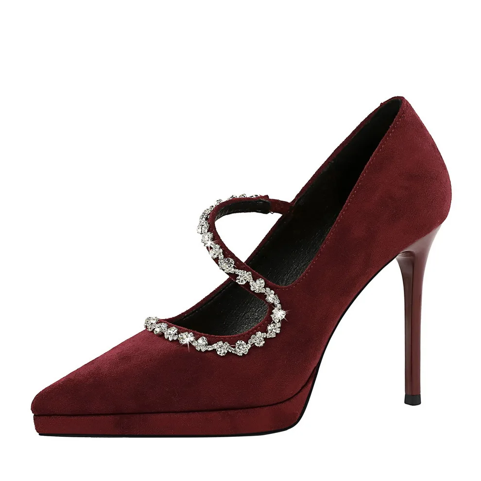 New Style Temperament Banquet Shoes Thin Heel Shallow Mouth Suveled Pointed Waterproof Table Drill Word Belt High Heel Shoes