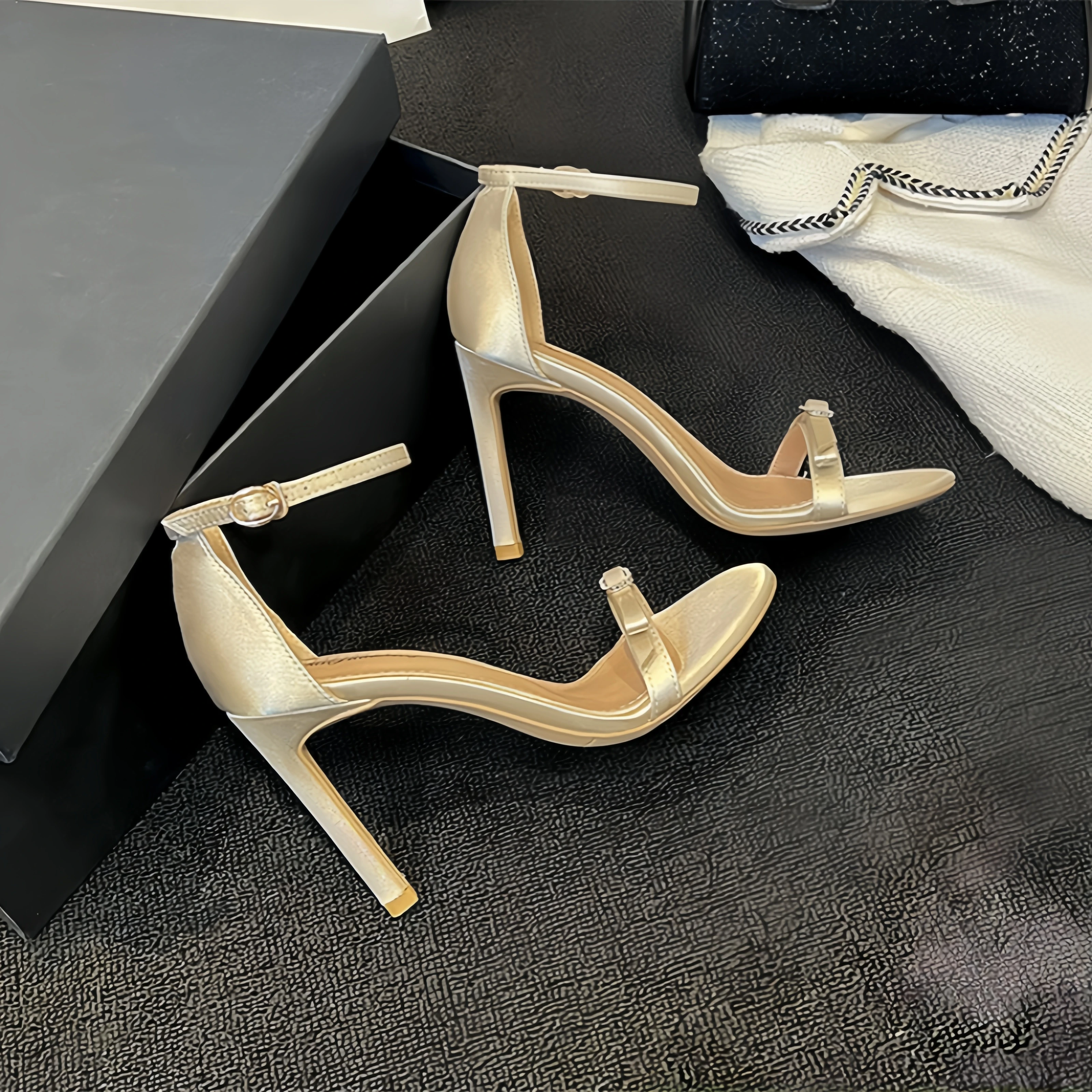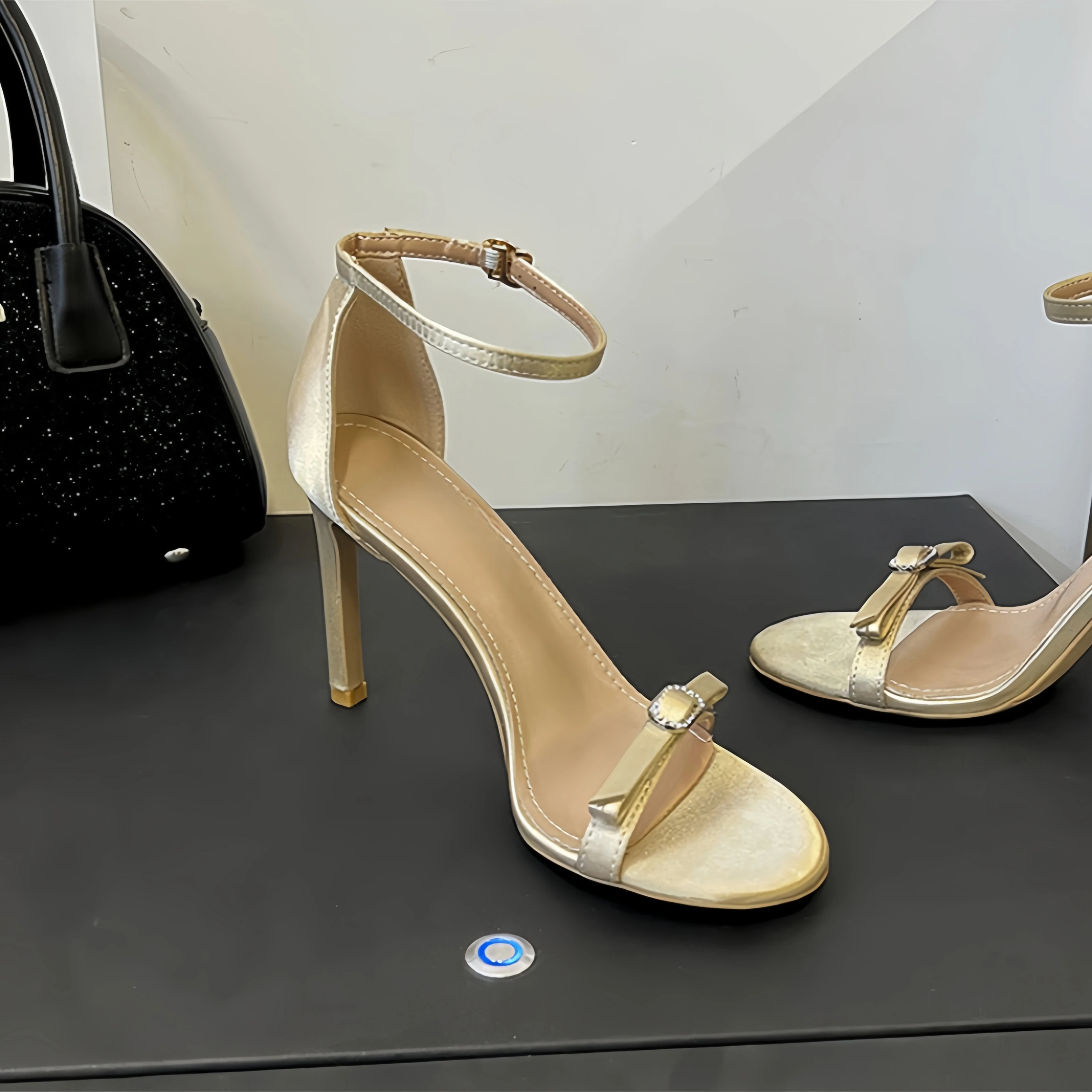 2026 New Fashion Satin High Heels for Women Korean Version Simple Thin Open Toe Bow with Round Head Lace-Up Closure