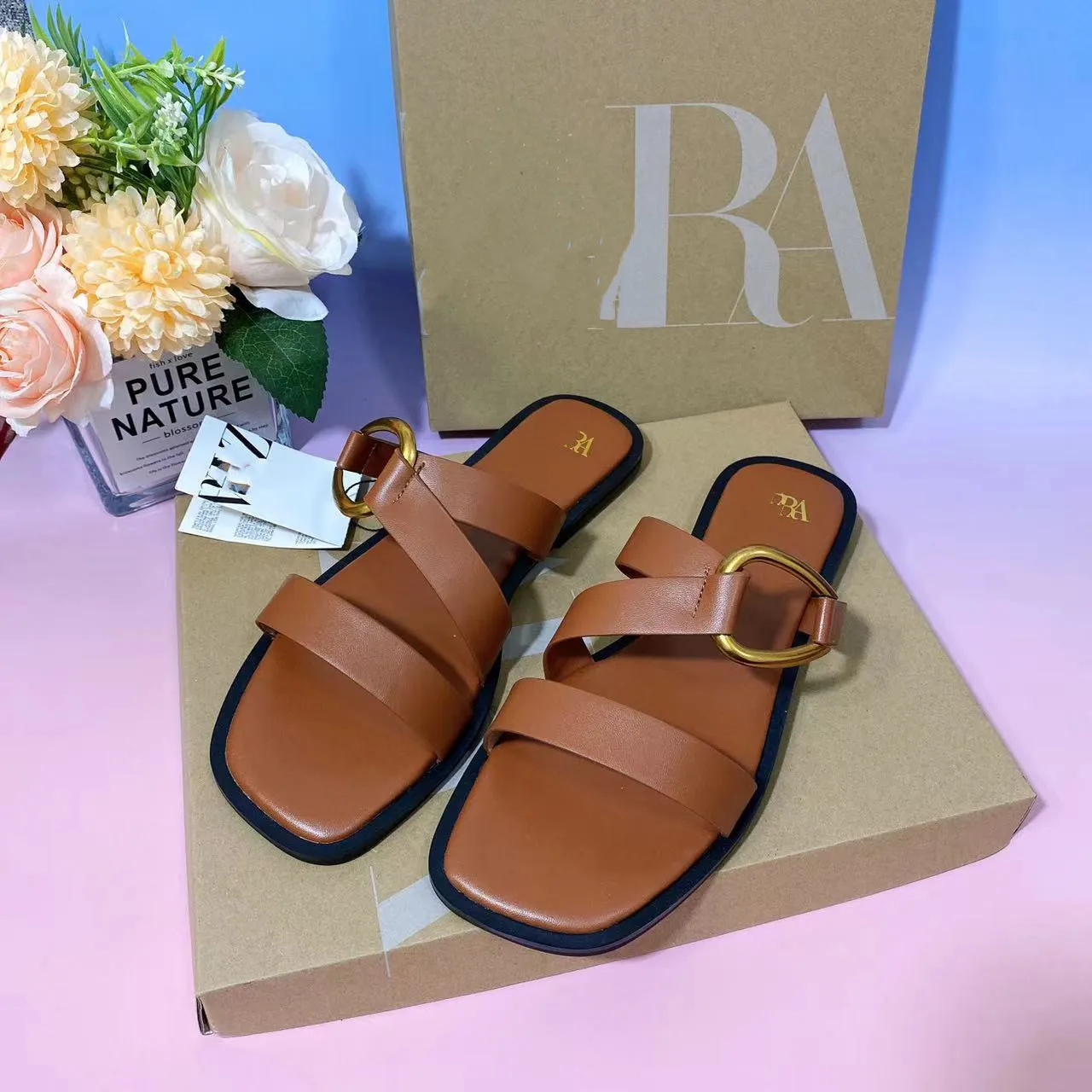 European and American Style Fashion Trends Wear Women Sandals Hardware Ring Buckle square - Toed slippers